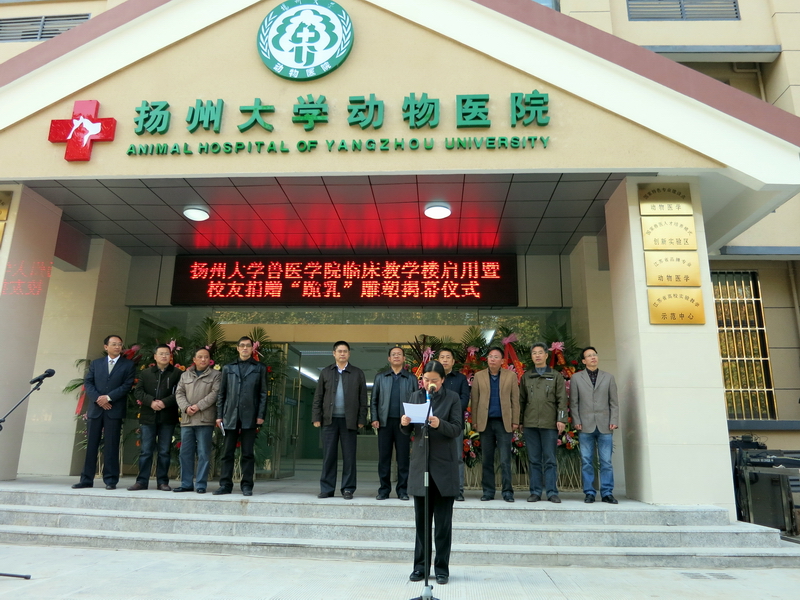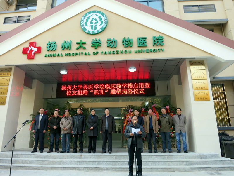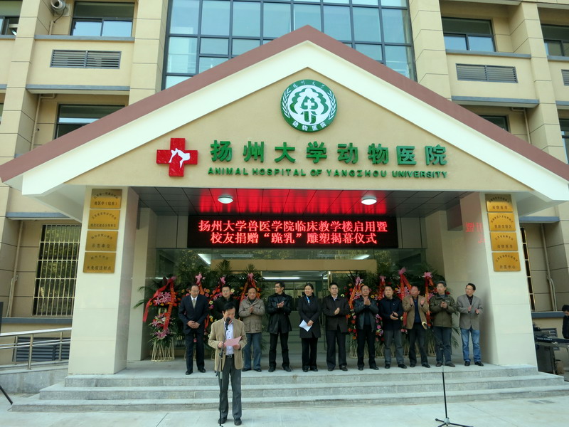 11月18日,兽医学院举行临床教学楼启用暨校友捐赠“跪乳”雕塑揭幕仪式,陈耀副校长、兽医学院常务副院长刘宗平、上海杰隆集团董事长成国祥分别致词,陈耀副校长和成国祥董事长共同为上海杰隆集团向兽医学院捐赠的“跪乳”雕塑揭幕。