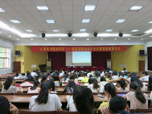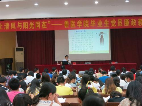 2014年6月13日下午,兽医学院在文汇路校区科技报告厅举行毕业生党员廉政专题教育活动,校纪委书记、校党委副书记刘延庆同志应邀为兽医学院2014届全体毕业生党员作了题为《立德修身,用廉洁成就梦想》的廉政教育专题报告,会议由院党委宋亭华书记主持。
