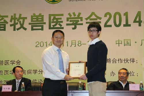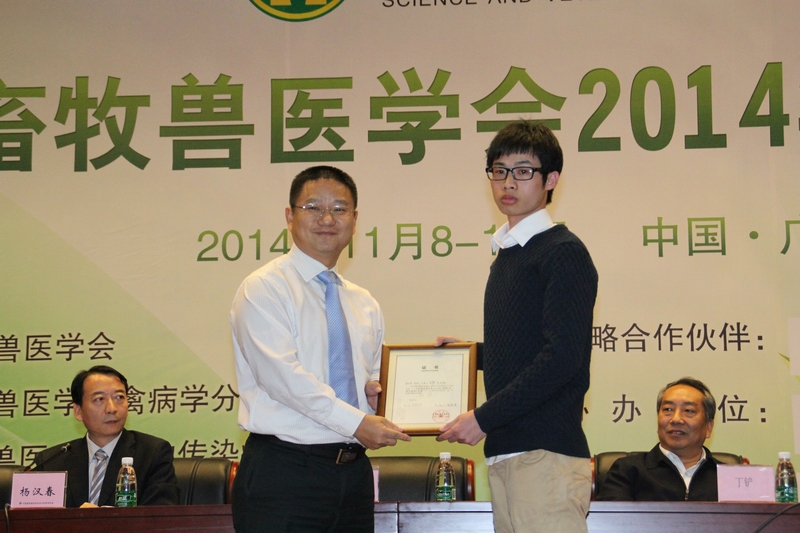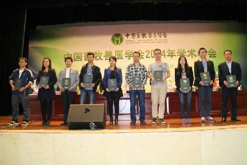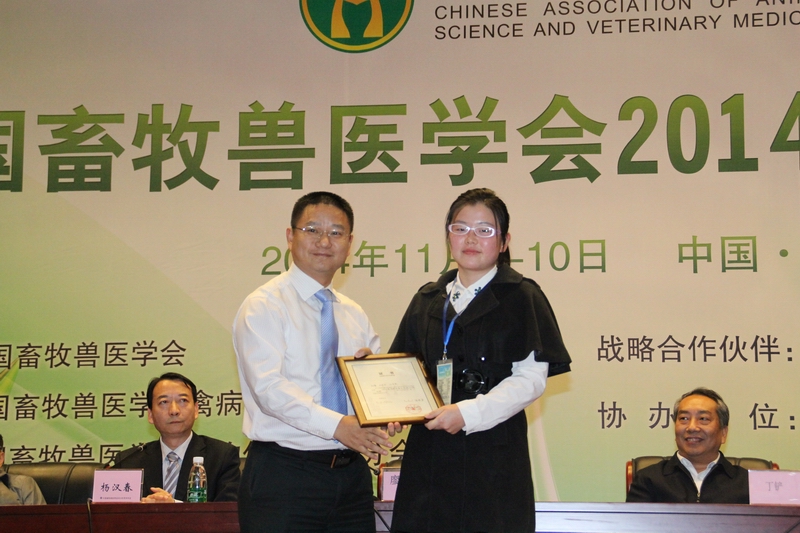 本次学术年会,得到了专家、学者、广大畜牧兽医科技工作者的积极参与,共征集论文550篇。年会期间,还组织专家评审优秀论文,颁发了中国畜牧兽医学会奖——优秀论文奖10名,优秀论文提名奖23名。我院师生积极参与,共投稿论文27篇,其中口头报告论文14篇,墙报展示13篇。经过专家组的评审,我院钟蕾博士所作的题为《H9N2禽流感病毒传播机制》的报告以及朱礼倩博士所作的题为《牛疱疹病毒1型对MAPK通路的调节机制研究》报告获得优秀论文奖,陈祥博士所作的《1993-2014年大肠杆菌质粒介导的喹诺酮类药物耐药性的流行特征》报告、朱寅彪博士所作题为《不同宿主来源H9N2亚型禽流感病毒生物学特性测定》的报告以及夏芃芃博士所作题为《猪氨肽酶N对产气肠毒素大肠杆菌(ETEC)K88ac黏附力的影响》的报告获得优秀论文提名奖。