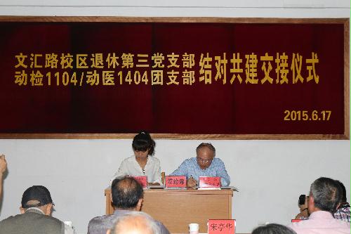 为了继承“老少共建、党团共建”这一优良传统,使结对共建之花开得更艳,在动检1104班同学面临毕业之际,退休三支部与动医1404团支部正式签约,启动新一轮的结对共建,顺利地完成了交接。
