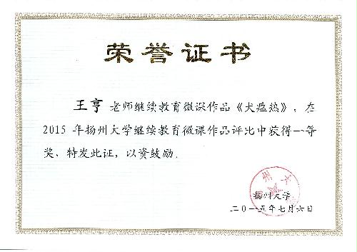 近日,学校组织了2015年扬州大学继续教育微课资源大赛,我院王亨老师的作品《犬瘟热》经校内外专家现场评审,荣获一等奖。