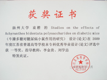 [2] 李金贵、刘学忠指导,作者袁楷. Studies on the effects of Achyranthes bidentata polysaccharides on diabetic mice(牛膝多糖对糖尿病小鼠作用的研究),江苏省高等学校优秀毕业论文一等奖, 江苏省教育厅, 2009