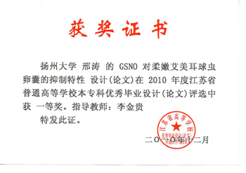 [1] 李金贵指导,作者邢涛. GSNO对柔嫩艾美耳球虫卵囊的抑制特性,江苏省高等学校优秀毕业论文一等奖, 江苏省教育厅,2010