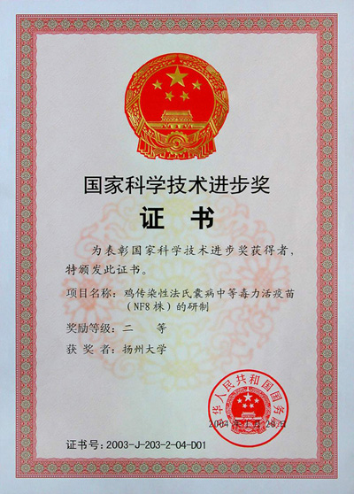 国家科技进步二等奖——鸡传染性法氏囊病中等毒力活疫苗(NF8株)的研制