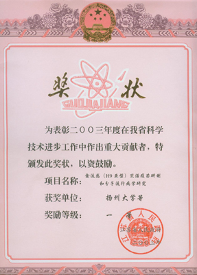 江苏省科技进步一等奖——禽流感(H9亚型)灭活疫苗研制和分子流行病学研究