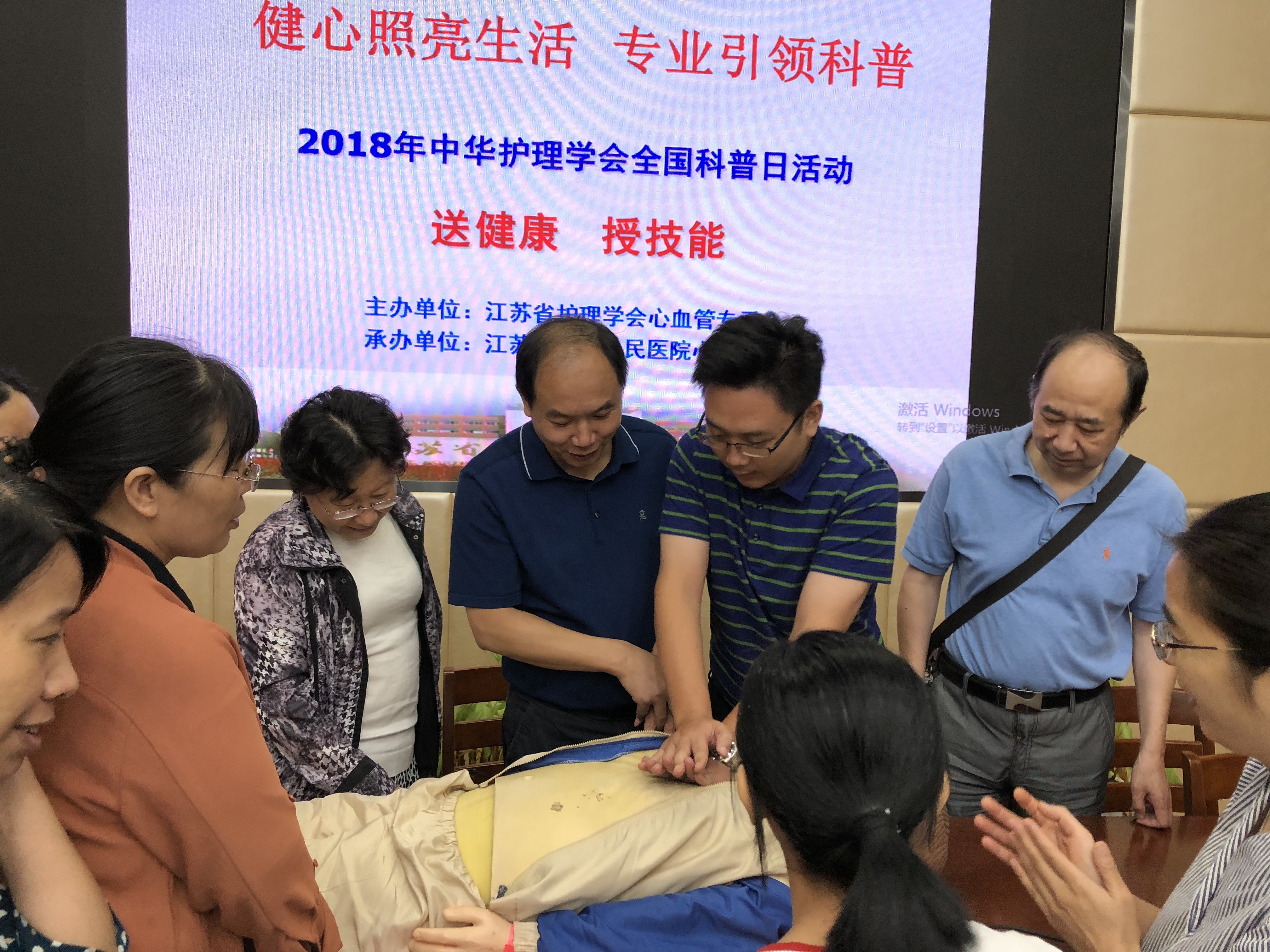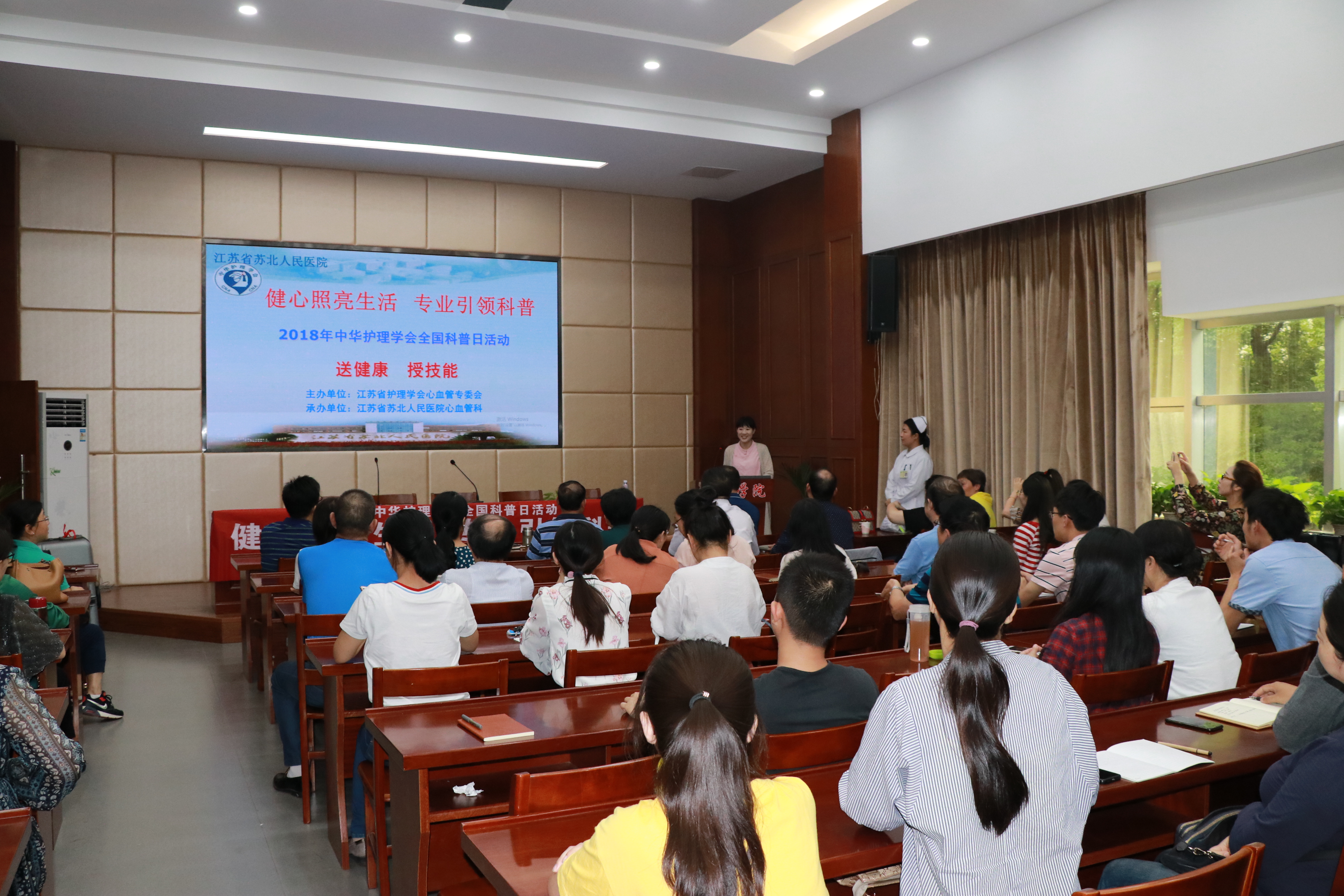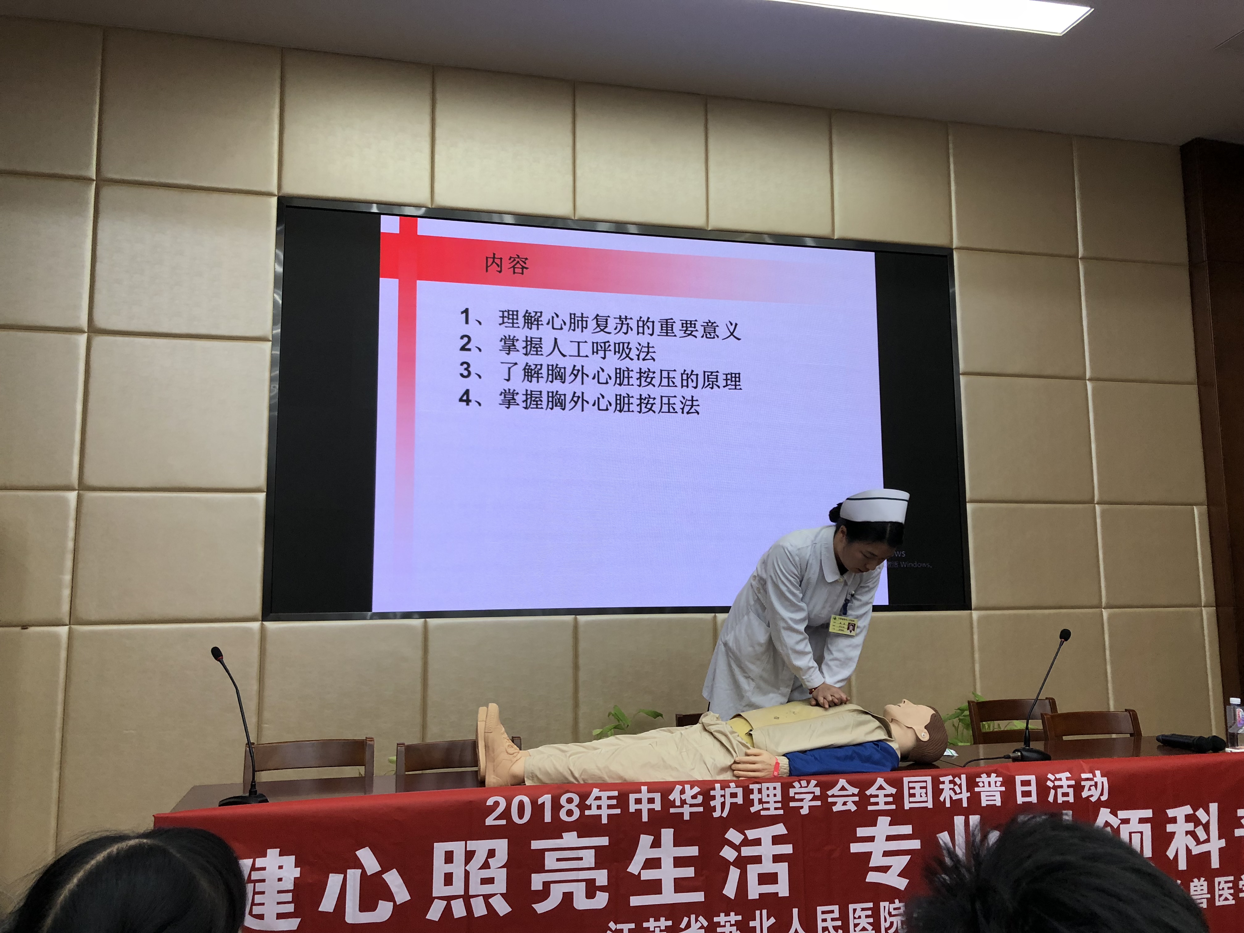 此次讲座邀请了苏北人民医院大内科护士长孙党红、心内科护士长戴莉、心内科护理医师葛支忱、胡丹丹、杨月,分别作了题为“心肌梗死的健康宣教”、“心肺复苏术”、“心肌炎的健康宣教”、“高血压的健康宣教”、“吸烟的危害”等精彩报告,同时进行了心肺复苏术实地操作演练,并对师生的健康咨询问题进行了深入的交流,师生们踊跃参加,场面热烈。