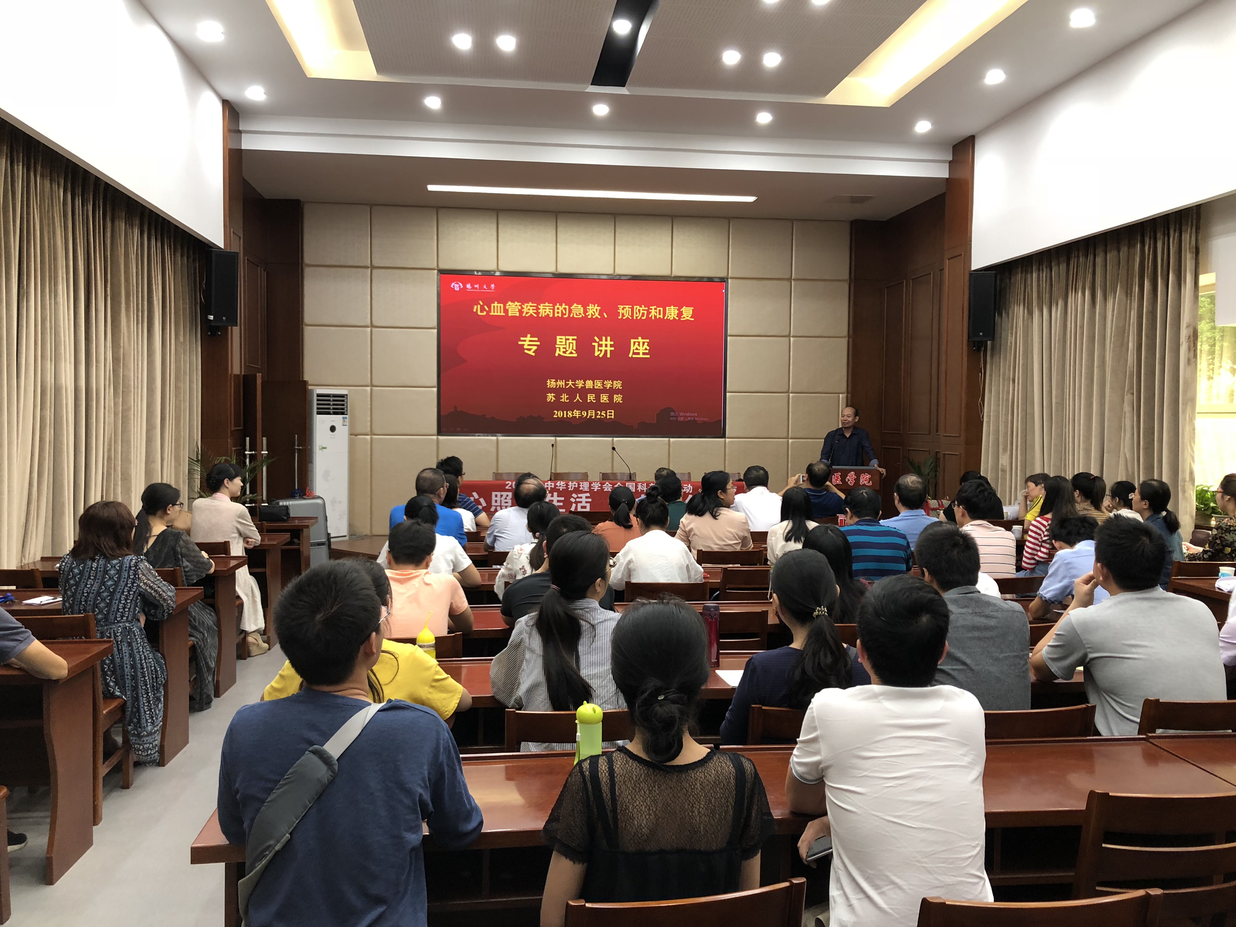 9月25日下午,“心血管疾病的急救、预防和康复”专题讲座在扬州大学文汇路校区兽医学院二楼报告厅举行,此次活动由扬州大学兽医学院与苏北人民医院联合举办,兽医学院党委副书记张陟遥教授主持。