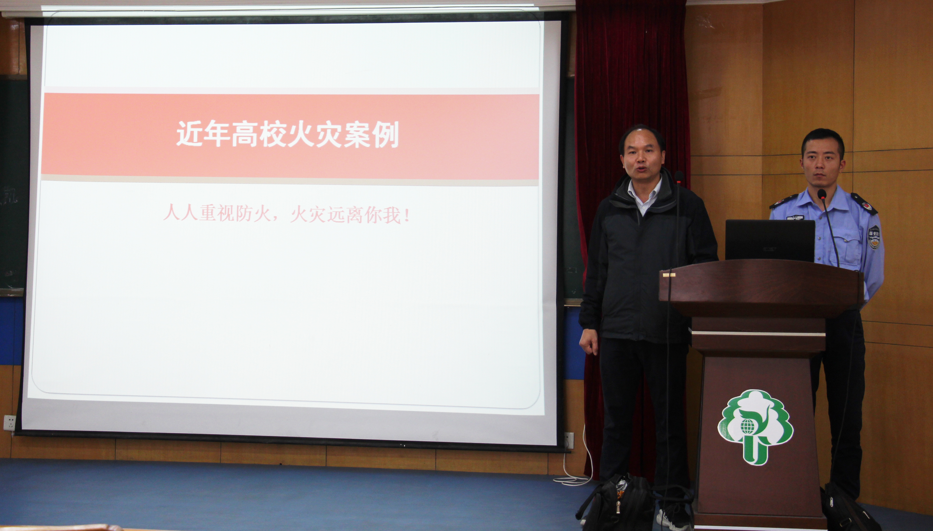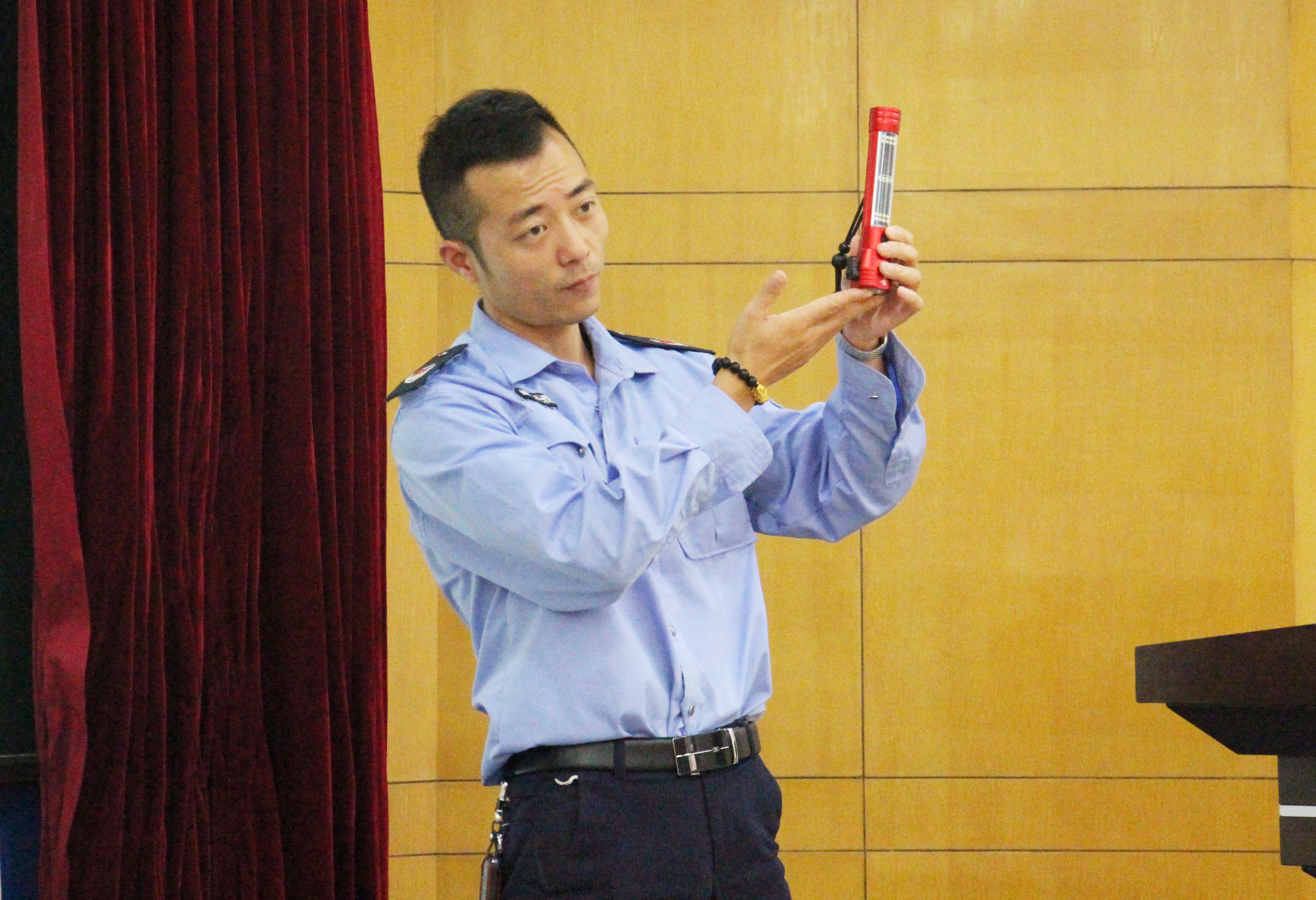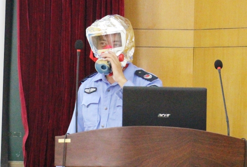 陈浩教官结合今年来国内多起典型火灾案例的惨痛教训,配合触目惊心的图片与现场视频,讲述了消防安全工作的重要性;针对生活中的实际情况,教官为大家讲解了多种火灾情况的应对方法,如公交车火灾可击碎窗户紧急逃生;楼房火灾火势向上蔓延,需准备湿毛巾捂住口鼻向低楼层逃生;较大火势的情况下只可躲在阳台等待救援等,提醒大家要主动学习消防安全知识,掌握基本的火灾逃生技能。教官也向大家介绍了多功能安全锤、火灾逃生面具、火灾逃生绳等消防器械的使用方法。高红明主任示范了灭火器的使用方法,有效拓宽了大家对消防安全知识的了解和掌握了消防设施的使用方法。