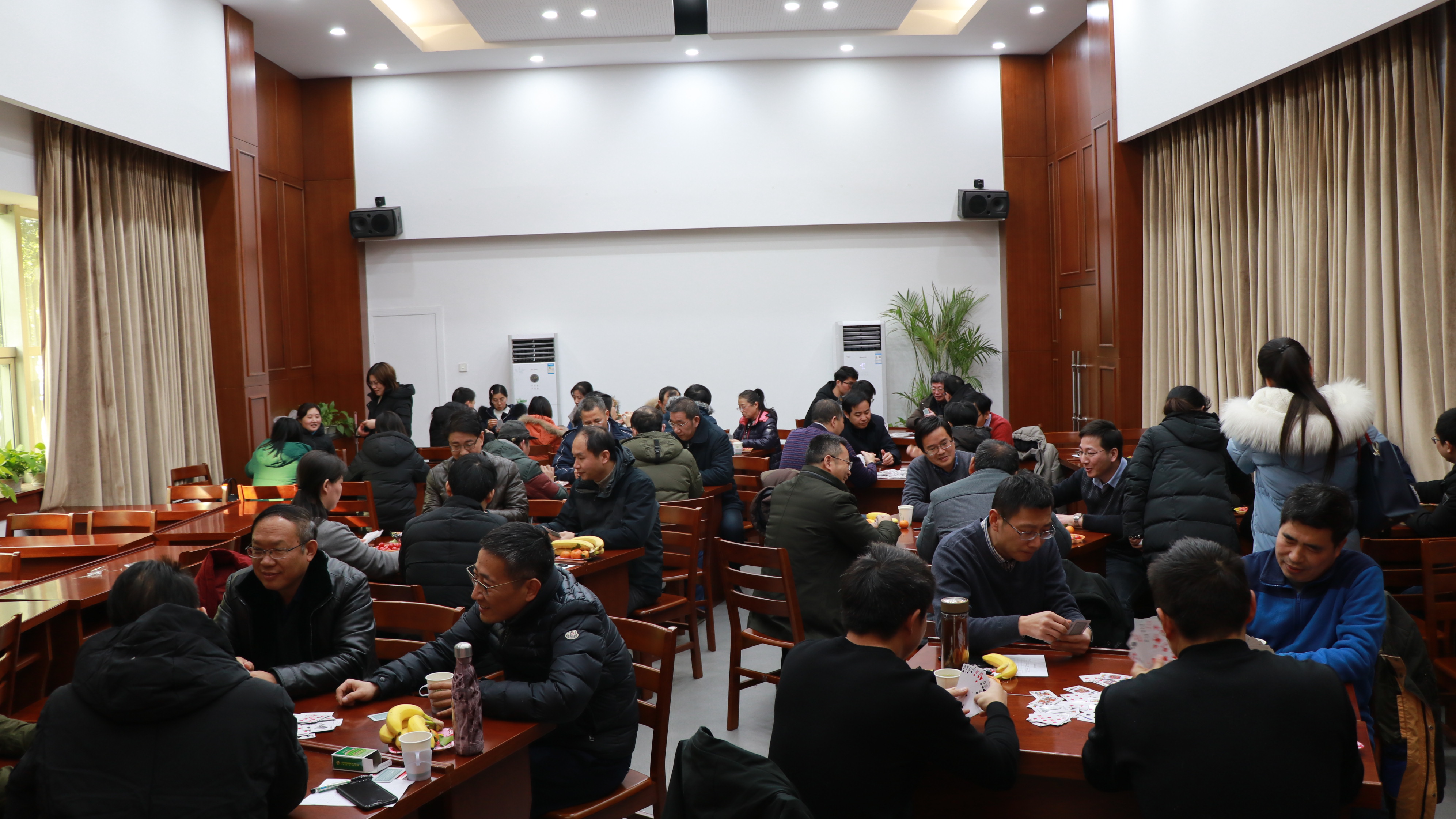 在庆祝2019年元旦到来之际,学院工会在12月29日下午在二楼报告厅举行教职工掼蛋比赛,来自学院六个工会小组的16支队伍参加掼蛋比赛。