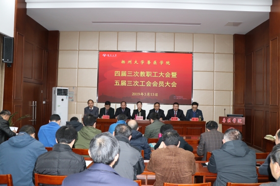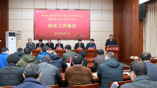 3月13日下午,学院在二楼学术报告厅隆重召开了四届三次教职工大会暨五届三次工会会员大会。全体院领导出席会议,会议由院党委副书记张陟遥主持。