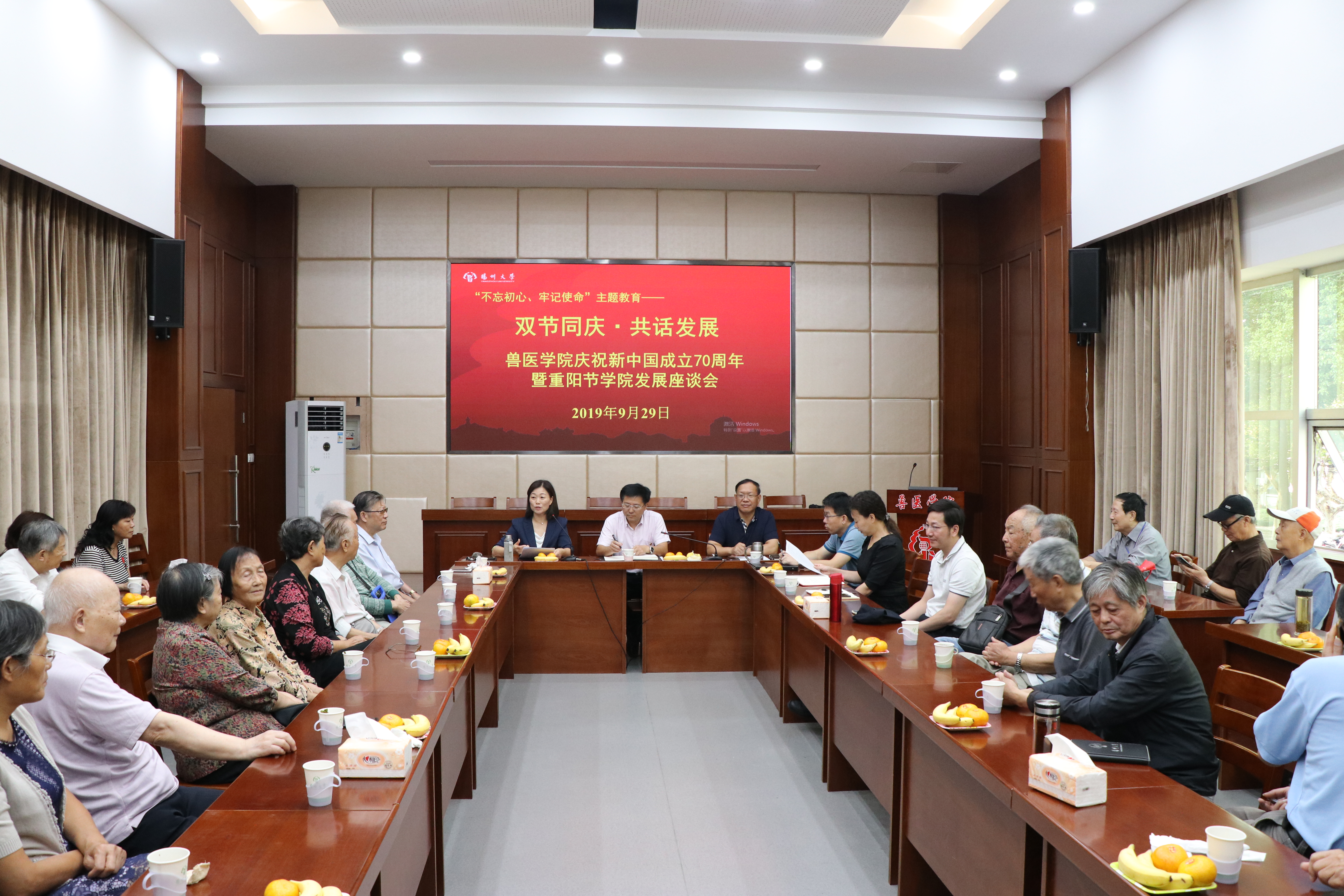 9月29日,值此国庆佳节及传统节日重阳节来临之际,为进一步联络老同志之间的感情,丰富退休生活,兽医学院特别组织开展双节同庆•共话发展——庆祝新中国成立70周年暨重阳节学院发展座谈会,校离退休处党委书记生永明,全体院领导、院工会、离退休人员50余人参加座谈会。座谈会由蔡丽娅书记主持。