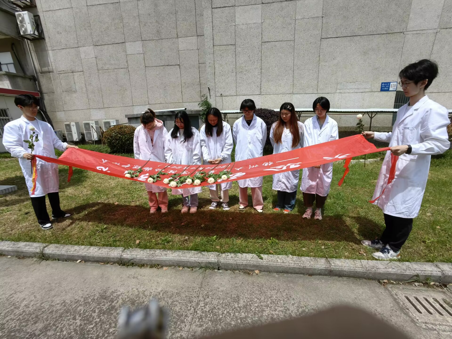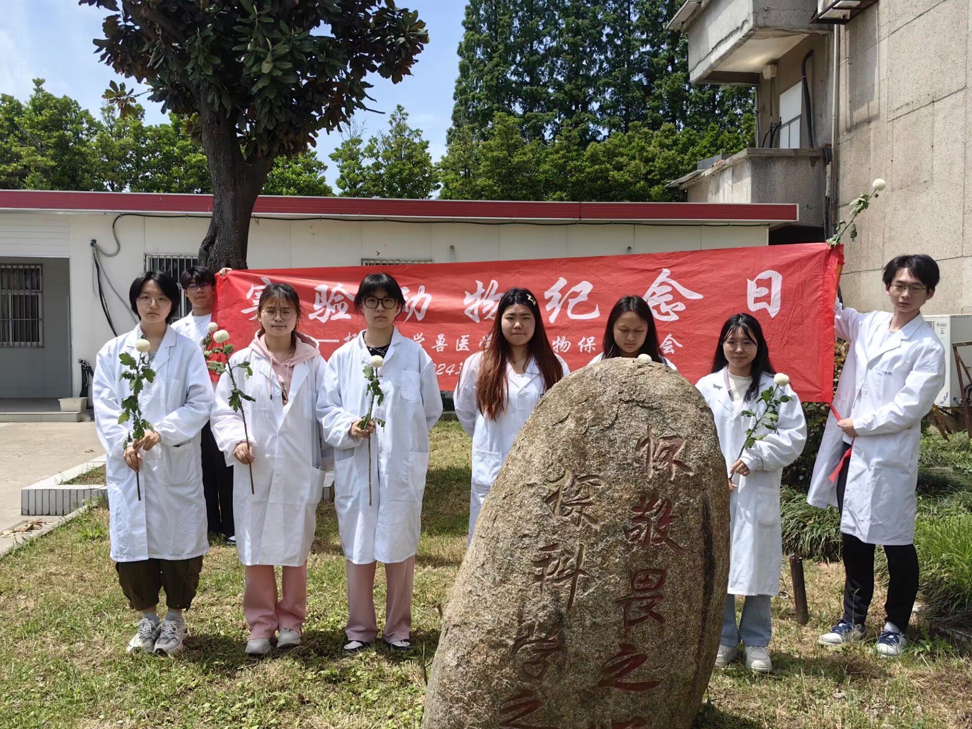 4月24日早上9点,动物保护协会成员们身穿白衣,在实验动物纪念碑前献花,致敬鞠躬,感谢它们为科研做出的贡献。花飨逝者,每一个生命都应得到尊重,每一个为科学事业献身的生命都应得到鲜花和注目。