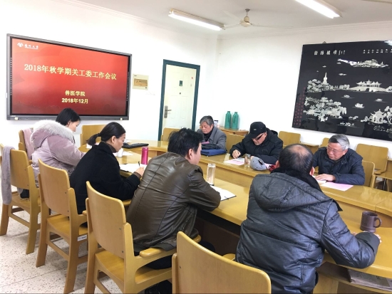12月13日下午,兽医学院在兽医大楼506会议室召开2018年秋学期关工委工作会议。校关工委办公室主任刘方云,文汇路退休第三党支部书记钱宗南,院关工委老师宋亭华、焦库华,院党委书记蔡丽娅,团委副书记杨扬、辅导员马倩出席会议。会议由院党委副书记张陟遥主持。
