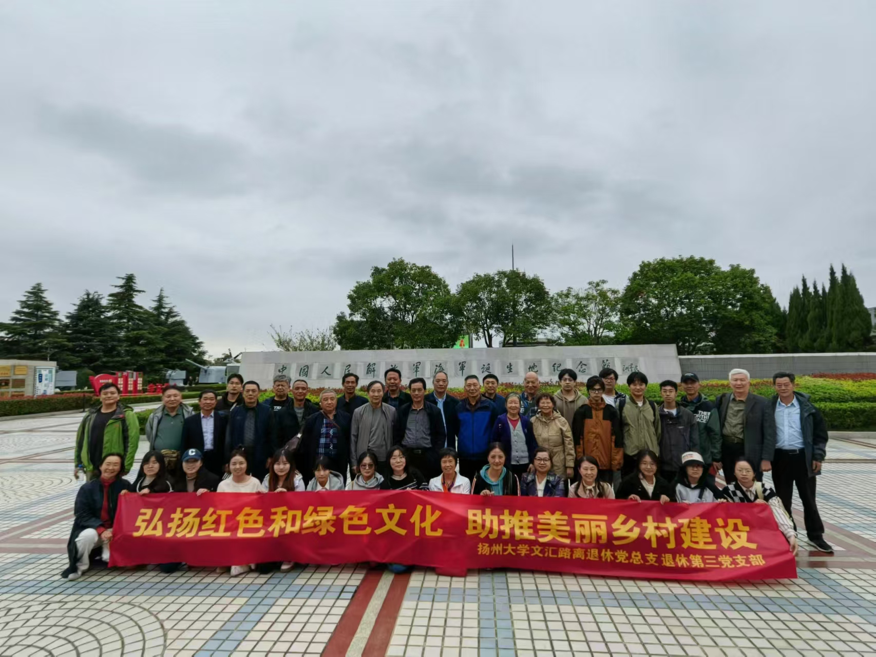 金秋10月,红旗与彩旗飘飘,恰逢中华人民共和国成立七十五周年,为激发大家的家国情怀,发扬继承大美中国的民族精神,10月20日,文汇路离退休党总支退休第三党支部和兽医学院共建班动医2002班同学共同开展了“弘扬红色和绿色文化 助推美丽乡村建设”为主题的党日活动,参观溱湖生态示范建设园区和泰州中国人民解放军海军延生地纪念馆。