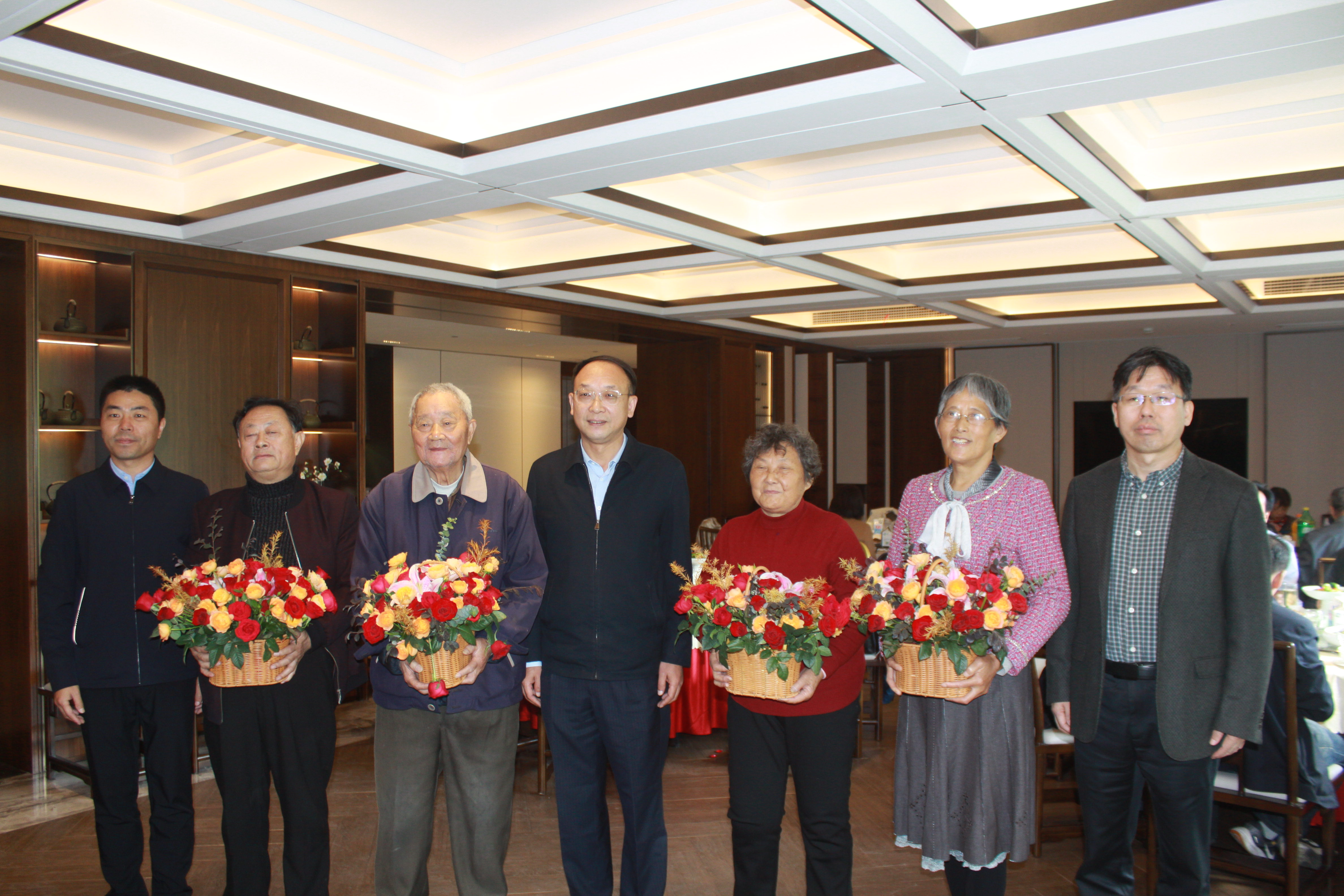 欢声笑语中,上午的游览悄然结束。学院党委书记王庆林、院长王志强、党委副书记李启波与工会主席许金俊陪同老教师及学生共进午餐。席间,院领导为今年满90岁的孙长美老师、80岁的谢玉兰老师,以及70岁的任建新、孙怀昌老师献上鲜花与花篮,代表学院致以节日问候与崇高敬意。王庆林书记表示,老教师是学院发展的奠基人与精神传承者,学院永远铭记他们的付出。他同时介绍了院领导班子与在场学生,并汇报了学院近年来在学科建设、人才培养与科研创新等方面取得的成果,强调这些成就离不开老一辈打下的坚实基础。
