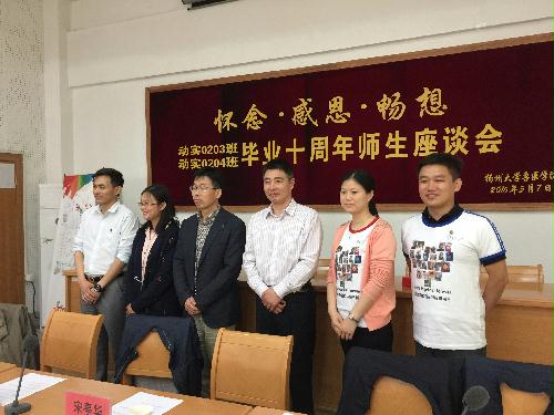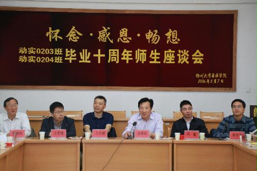 在“怀念·感恩·畅想”毕业十周年师生座谈会上,宋书记代表学院对校友们返回母校表示热烈欢迎,并介绍了学院发展情况,同时感谢校友们对学院事业发展的关心和支持;王主任介绍了学校校友会工作,并简要回顾了担任学院团委书记时和同学们的相处,向校友们播放了校友工作宣传片;马书记和王院长分别为两个班的代表佩戴了校友徽章;随后,校友们就各自毕业后的发展情况进行了深入的交流,大家纷纷怀念在母校生活,表达了对母院和老师的思念与感激之情,并憧憬美好的未来;薛老师和两位班主任对校友们提出了殷切的希望与祝福。座谈会由姚老师主持。