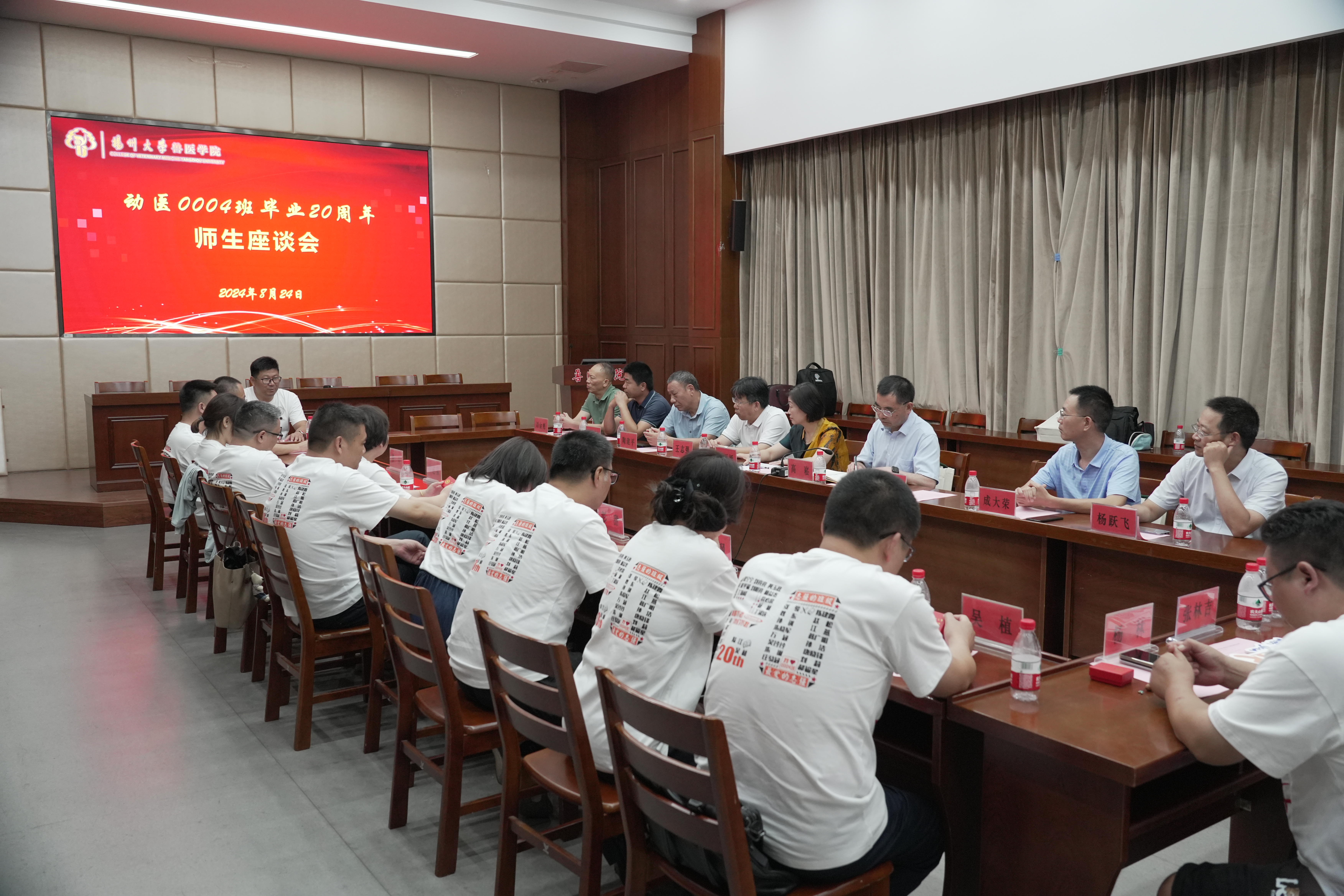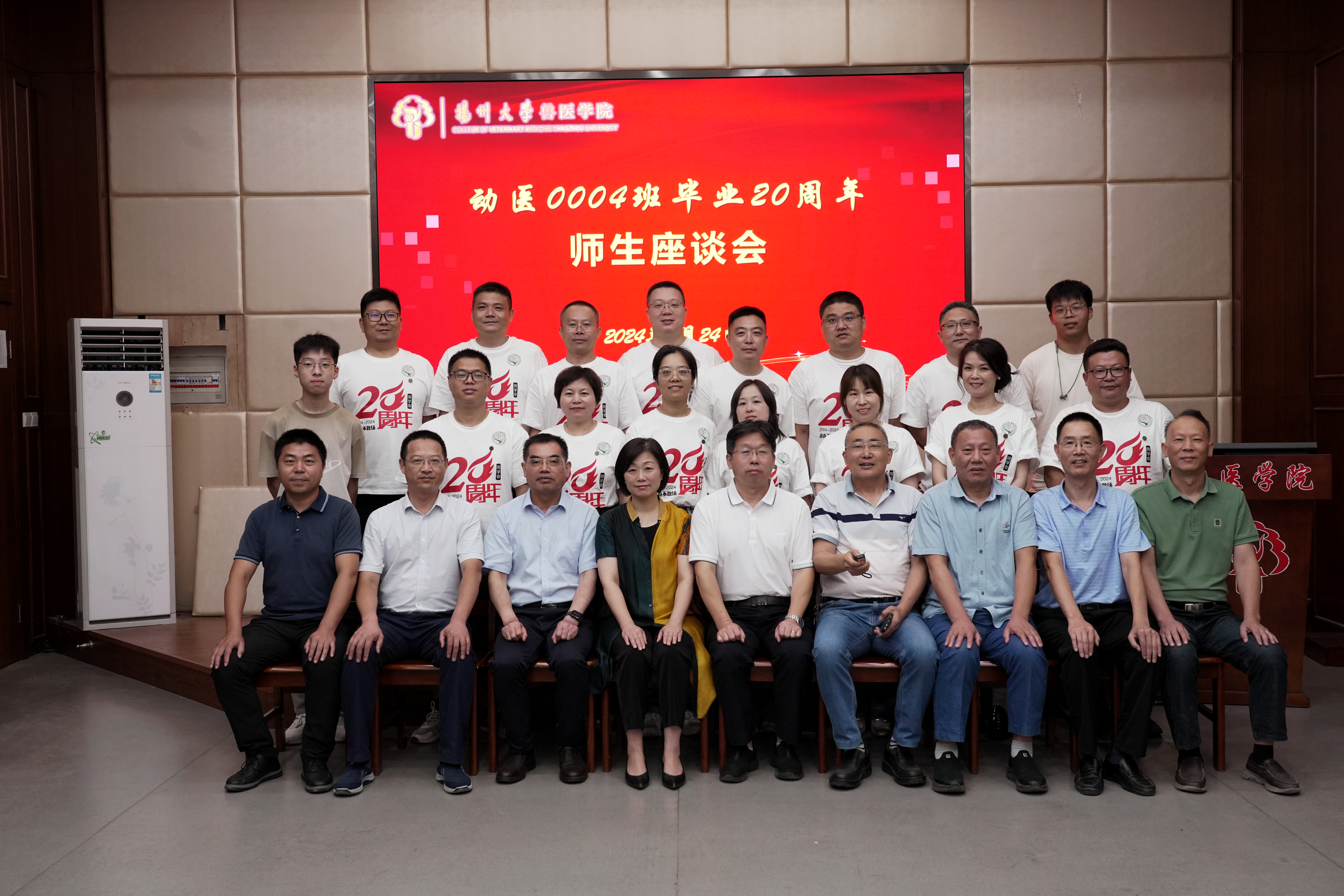 金秋送爽,丹桂飘香。8月24日,扬州大学兽医学院动医0004班校友毕业20周年返校,举办“学在动医、情在动医、乐在动医”聚会活动。校友们参观校园并召开了师生座谈会,院党委书记蔡丽娅致欢迎辞并介绍兽医学院的发展历程及取得的重大成就,班主任王志强院长到场并作了激情洋溢的讲话,同学们重温同窗情谊,交流各自的生活和工作经历。同时,蔡书记向学生代表彭甜颁发校友徽章,学生代表丁海峰总监向老师代表陶建平赠送伴手礼。会议由班长、江苏农牧科技职业学院动物医学院副书记郝福星主持。