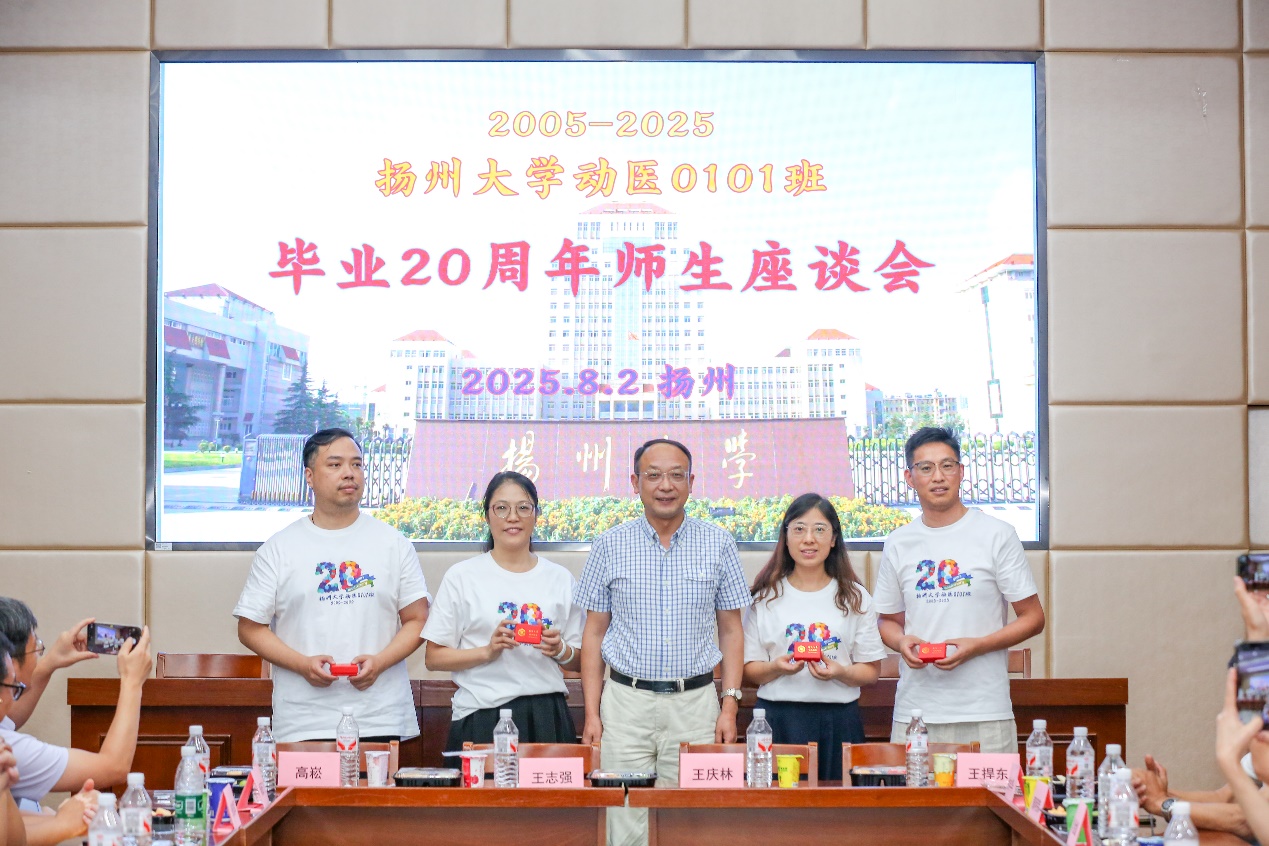 2025年8月2日至3日,扬州大学兽医学院2005届动物医学专业0101班的校友们,在阔别母校二十载之后重返校园,成功举办了毕业二十周年返校活动。此次活动不仅是一次深情的重逢,更是一次心灵的回归与情感的升华。出席本次活动的有兽医学院党委书记王庆林、院长兼院党委副书记王志强、原动物医学系辅导员姚丰华、班主任王捍东,以及高崧、刘金彪、张信军、杨跃飞、周明荣等任课教师代表。他们全程参与座谈会并陪同参观,与校友们共话情谊、畅谈发展。
