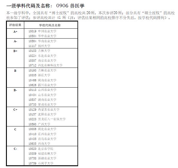 12月28日,教育部学位与研究生教育发展中心正式公布全国第四轮学科评估结果,我院兽医学科与华南农业大学并列排名第三,中国农业大学和华中农业大学并列第一。兽医学一级学科中,全国具有“博士授权”的高校共有20所,本次参评20所;部分具有“硕士授权”的高校也参加了评估;参评高校共计41所。