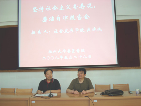 5月28日下午,社会发展学院吴林斌副教授应兽医学院邀请,为全院教职工作了一场“坚持社会主义荣辱观——廉洁自律报告会”。报告会上,吴林斌老师围绕社会主义核心价值体系与社会主义荣辱观的内容和关系、社会主义荣辱观的时代要求、以及在廉洁自律方面对高校教师的要求等内容作了详细的阐述。通过吴林斌老师的报告,学院教职工对社会主义核心价值体系和“八荣八耻”的内涵、对社会主义荣辱观的功能、作用、时代特点有了深刻的了解,对作为一名高校教师如何做到淡泊名利、廉洁自律有了清楚的认识,这对学院教职工在今后的工作中树立良好的教师形象、更好地做到为人师表,引导学生树立正确的世界观、人生观、价值观将起到积极的促进作用。