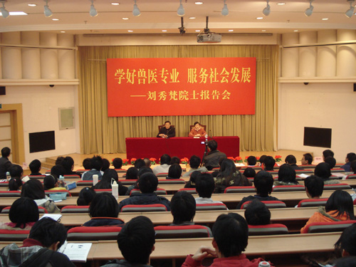 2008年12月4日下午,兽医学院在逸夫图书馆报告厅举行“学好兽医专业,服务社会发展”——刘秀梵院士报告会,报告会由兽医学院党委书记杨建平教授主持,共有350多名师生参加了报告会。