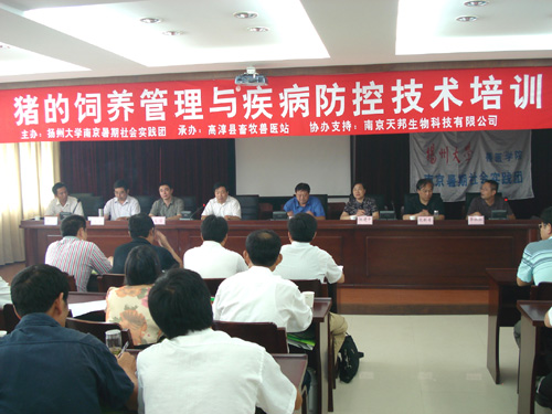7月5日,扬州大学兽医学院和高淳县畜牧兽医站在高淳县农林局报告厅举办猪的饲养管理与疾病防控技术培训班。培训班由高淳县农林局局长王正深主持,扬州大学兽医学院院长秦爱建、江苏省疫控中心副主任包新奇出席本次活动并分别致辞。