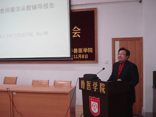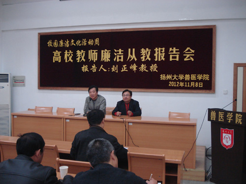 发放仪式结束后,《高校教师廉洁从教读本》的参编作者,扬州大学社会发展学院刘正峰教授应邀为兽医学院教职工作了一场“高校教师廉洁从教”辅导报告。报告中,刘正峰教授详细介绍了参与编写《高校教师廉洁从教读本》的经历和感受,并从高校教师廉洁从教问题的背景、内涵、意义、途径等方面诠释了高校教师为什么要廉洁从教以及如何廉洁从教。整个报告契合实际,内容丰富,生动形象,精彩纷呈。整个活动得到了广大教职工的积极响应,取得了较好的效果。