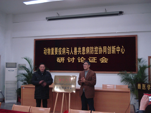 12月16日上午,学校邀请相关专家对由我校牵头、联合省内外高校、科研院所、政府主管部门及行业骨干企业组建的“动物重要疫病与人兽共患病防控协同创新中心”召开了建设方案研讨论证会。范健副校长、省科技厅产学研合作处万发苗副处长出席会议并讲话,刘秀梵院士和万发苗副处长共同为协同创新中心揭牌。来自省内相关高校、政府主管部门、科研院所及企业的10多位专家参加了会议。
