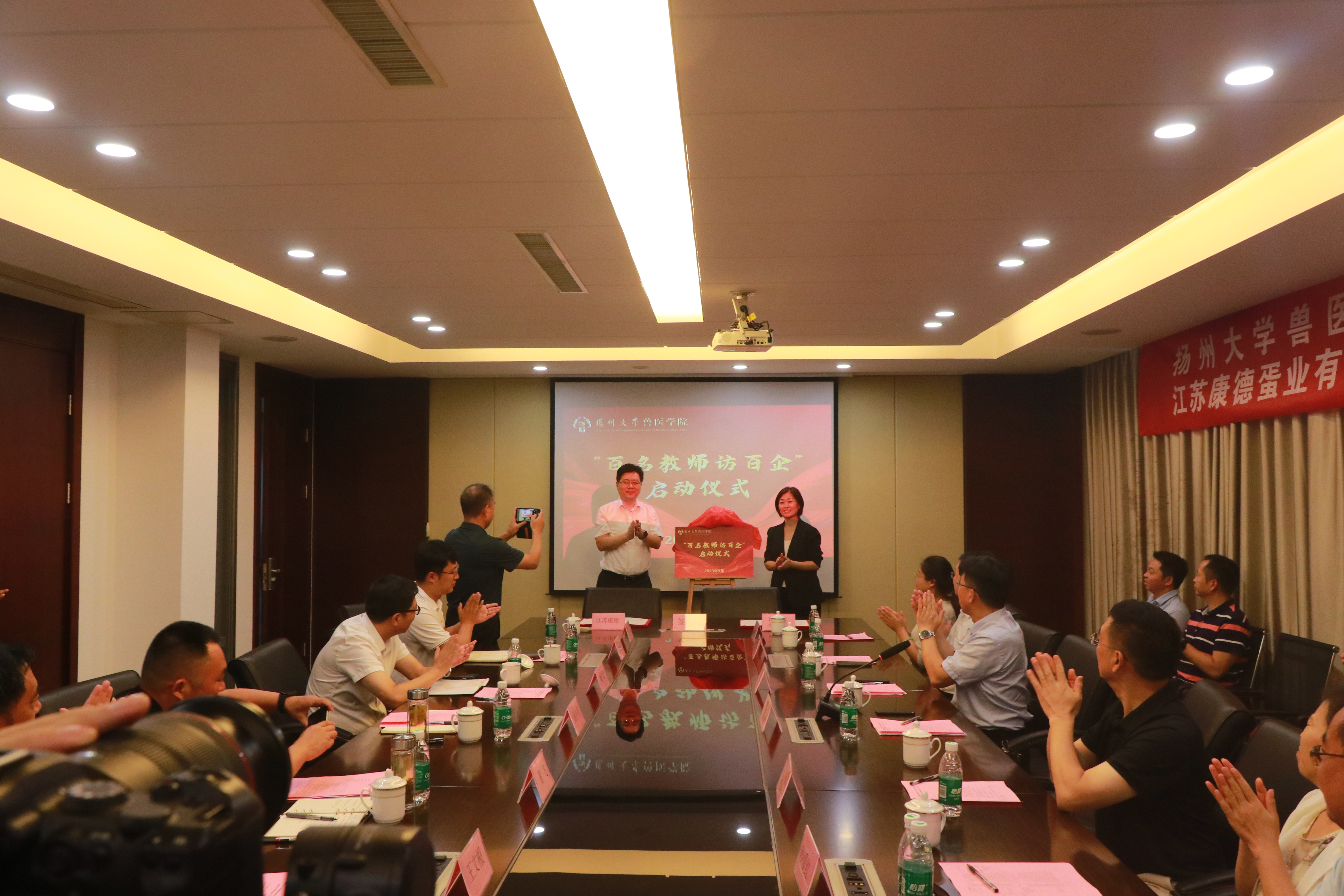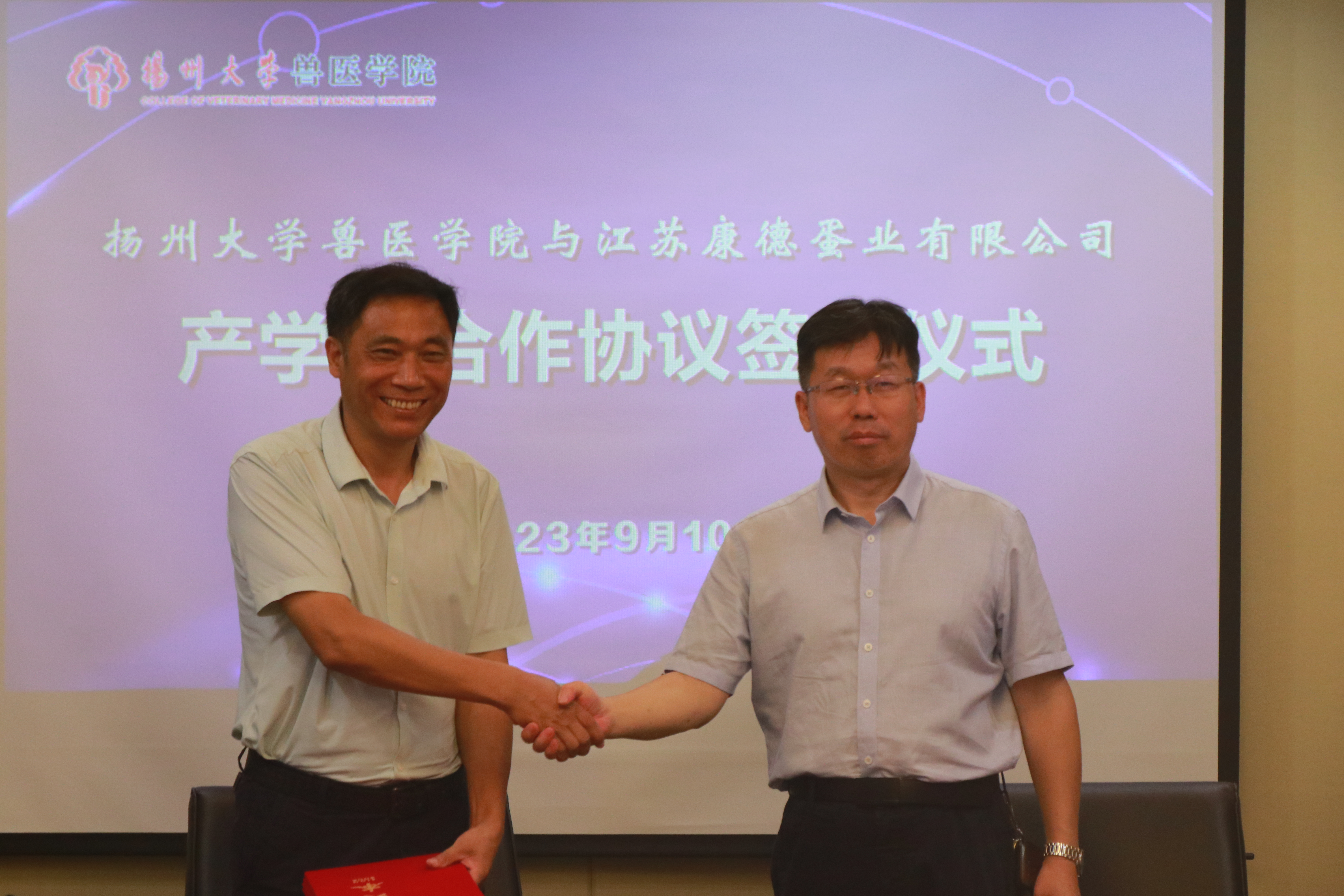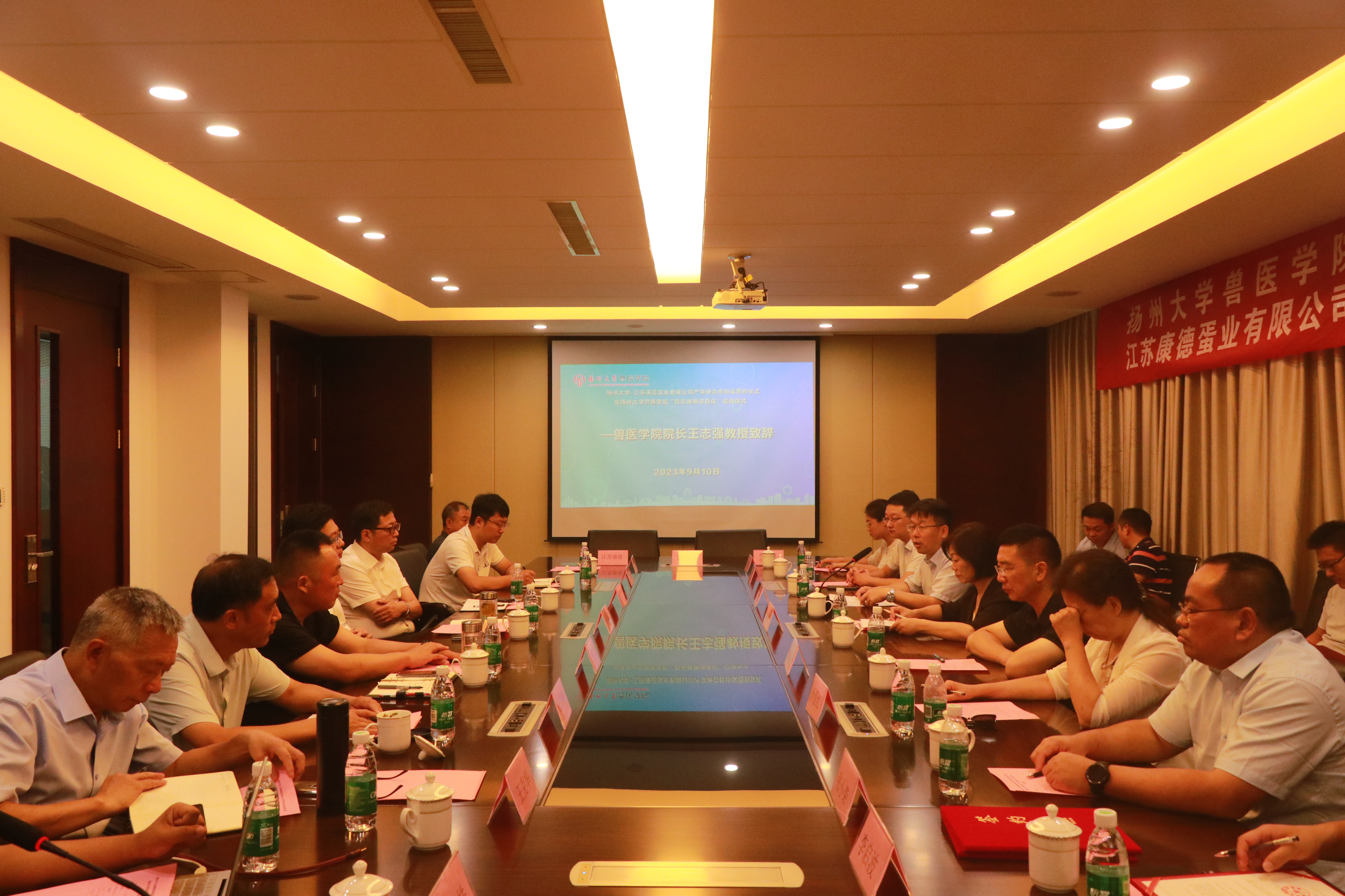 9月10日,我院与江苏康德蛋业有限公司举行产学研合作协议签约暨兽医学院“百名教师访百企”启动仪式。海安市人民政府副市长周小军,农业农村局局长臧忠、副局长董飞,江苏康德蛋业有限公司董事长王文根、总经理王俊伟,学院党委书记蔡丽娅、院长王志强、副书记沙爱红、副院长秦涛,国家蛋鸡产业技术体系疾病防控研究室主任、国家蛋鸡产业技术体系“一县一业”示范县(海安市)工作组副组长吴艳涛教授以及其他企业代表和学院青年教师代表等30余人参加活动。
