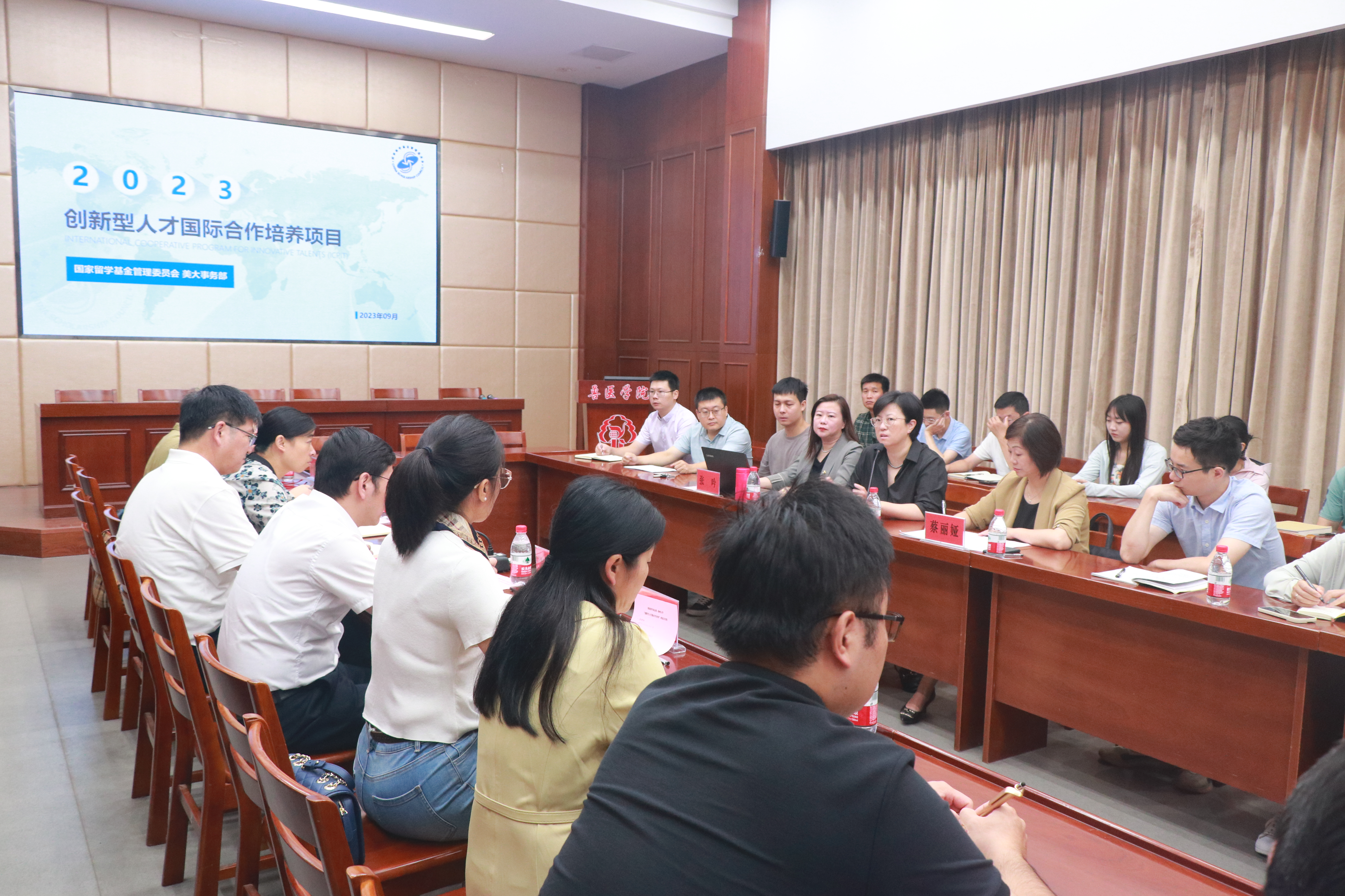 9月12日上午,我校“创新型人才国际合作培养”座谈会在兽医学院二楼学术报告厅召开。国家留学基金管理委员会(以下简称国家留学基金委)美大事务部主任孟莉莅临座谈会做政策解读和交流研讨。座谈会由我院牵头组织,国际合作与交流处处长张吟、兽医学院、农学院、植物保护学院、园艺园林学院、动物科学与技术学院、生物科学与技术学院等外事分管领导、我院部分青年教师代表和学生代表近60人参加会议。座谈会由学院党委书记蔡丽娅主持。