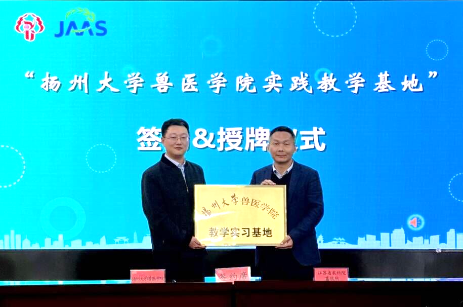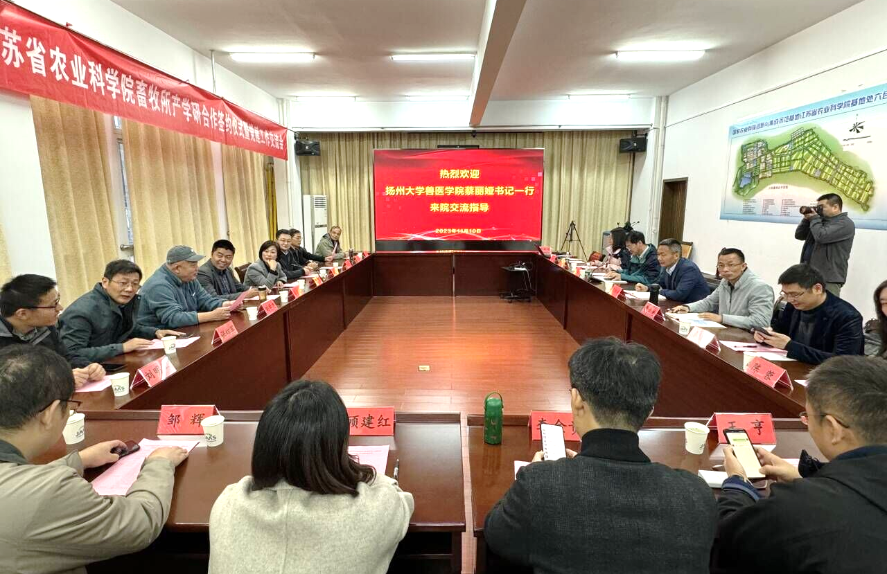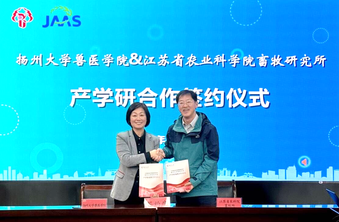 11月10日,我院与江苏省农业科学院畜牧研究所产学研合作签约仪式暨扬州大学兽医学院“百名教师访百企”活动在南京竹镇隆重举行。江苏省农业科学院畜牧研究所副所长陈晓强、六合基地副主任孙加强,扬州大学兽医学院党委书记蔡丽娅、副院长秦涛以及基地骨干、临床兽医系教职工等30余人参加。陈晓强主持活动。