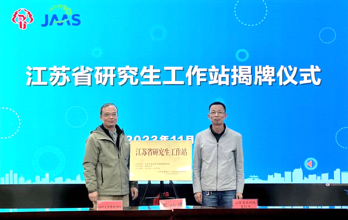 活动现场,江苏省农业科学院畜牧研究所陈晓强副所长介绍畜牧所六合基地基本情况,以及与扬州大学兽医学院的合作基础。扬州大学兽医学院党委书记蔡丽娅致辞,并重点介绍学院的师资力量和学科特色。随后,蔡丽娅书记与陈晓强副所长共同签订产学研合作协议。秦涛副院长与孙加强副主任进行“扬州大学兽医学院实践教学基地”签约以及授牌仪式。兽医学院袁玉国副教授与畜牧所曹少先研究员进行江苏省研究生工作站的揭牌仪式。