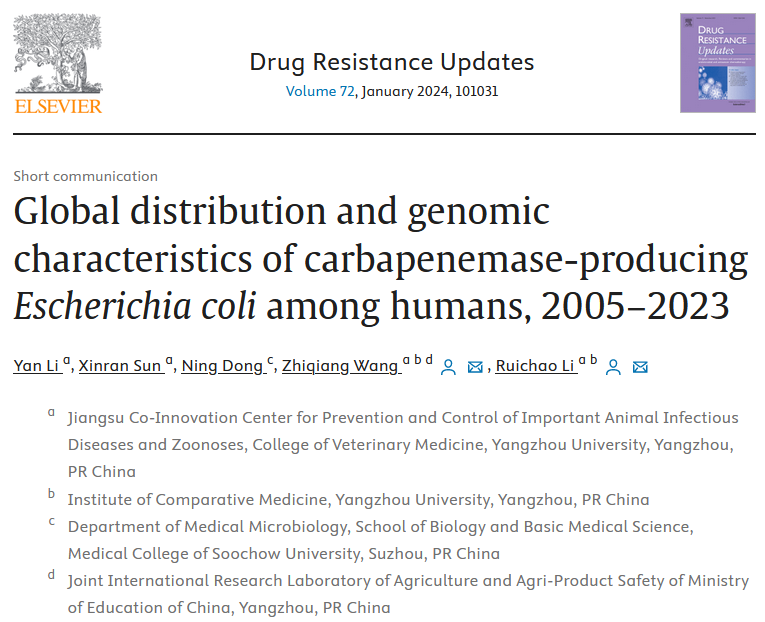 近日,我院王志强教授研究团队在《Drug resistance updates》上发表了题为《Global distribution and genomic characteristics of carbapenemase-producing Escherichia coli among humans, 2005-2023》的研究论文,该研究对全球范围内的人源碳青霉烯耐药大肠杆菌进行了系统的基因组学分析,揭示了碳青霉烯类耐药大肠杆菌在不同国家的流行与分布特征,为后续进行耐药菌防控提供了数据支撑。