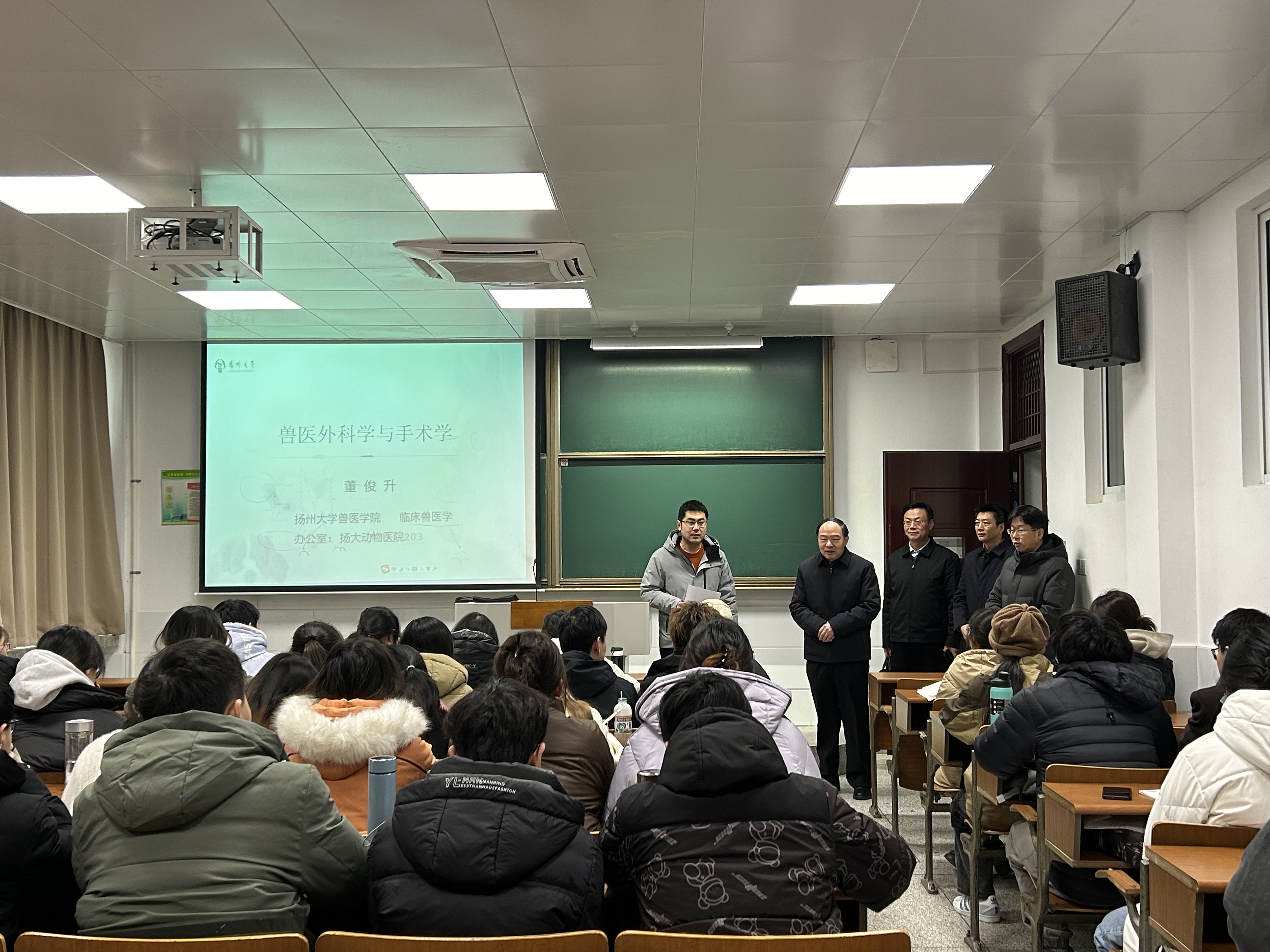 课前,焦新安书记来到我院《兽医外科学与手术学》课堂,向我院青年教师董俊升了解了课堂情况。焦书记向学生介绍道,兽医专业应用前景广阔,除了兽医师,还有海关检疫等部门,也延伸到医学、生物学、环境保护等领域,对人兽共患疾病的防治和动物性食品安全都至关重要。焦书记希望同学们充分用好兽医学科的优势,用好学校的学习资源,树立远大目标,勤勉上进,开拓进取,学好专业知识,将来在不同领域做出扬大兽医人的贡献。