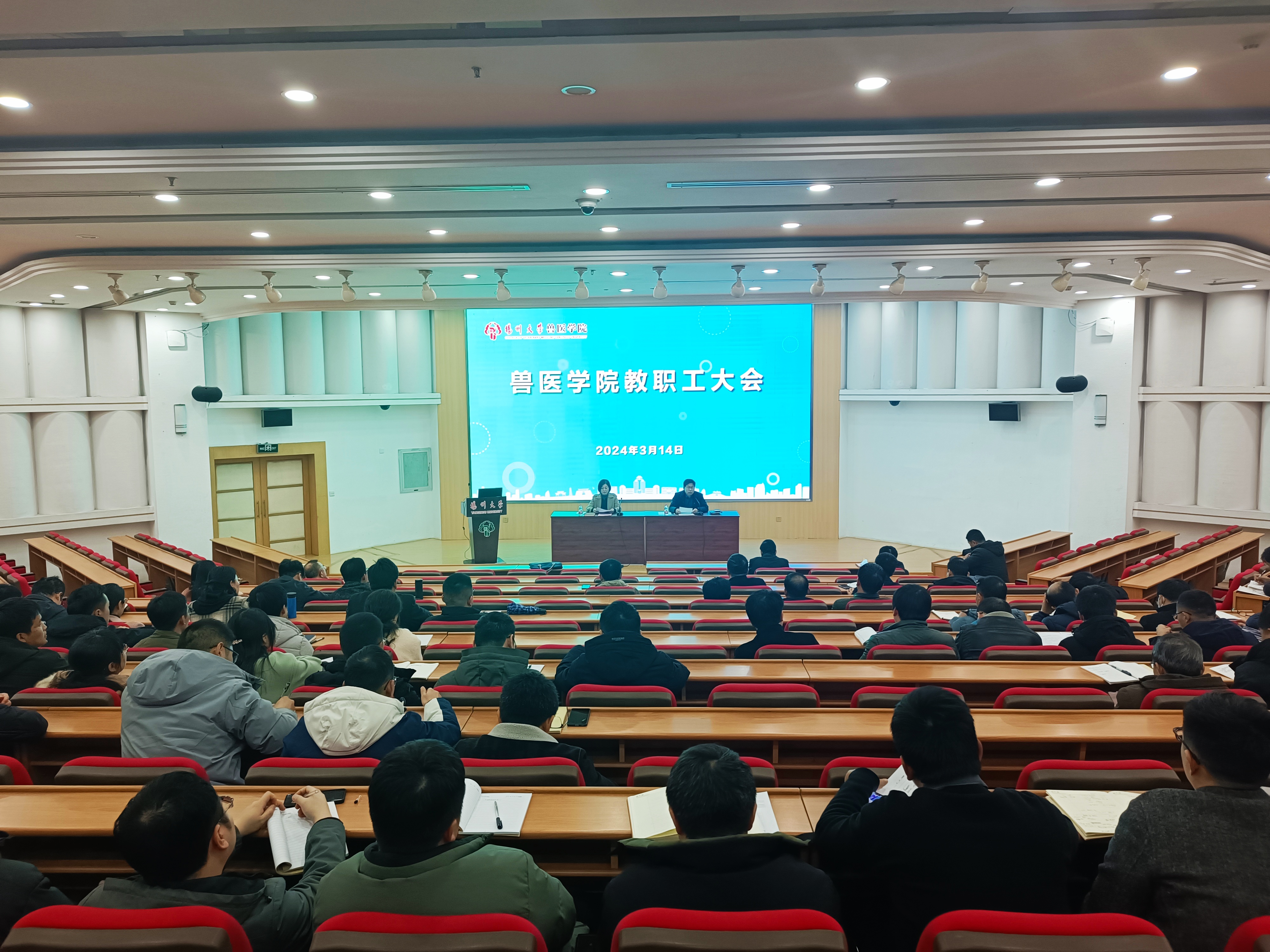 3月14日,兽医学院在荷花池校区逸夫报告厅举行新学期全院教职工大会。院党委书记蔡丽娅作教职工“开学第一课”专题教育和安全稳定专题教育。院长王志强对学院近期的重点工作进行部署。会议由院长王志强主持,全院教职工参会。
