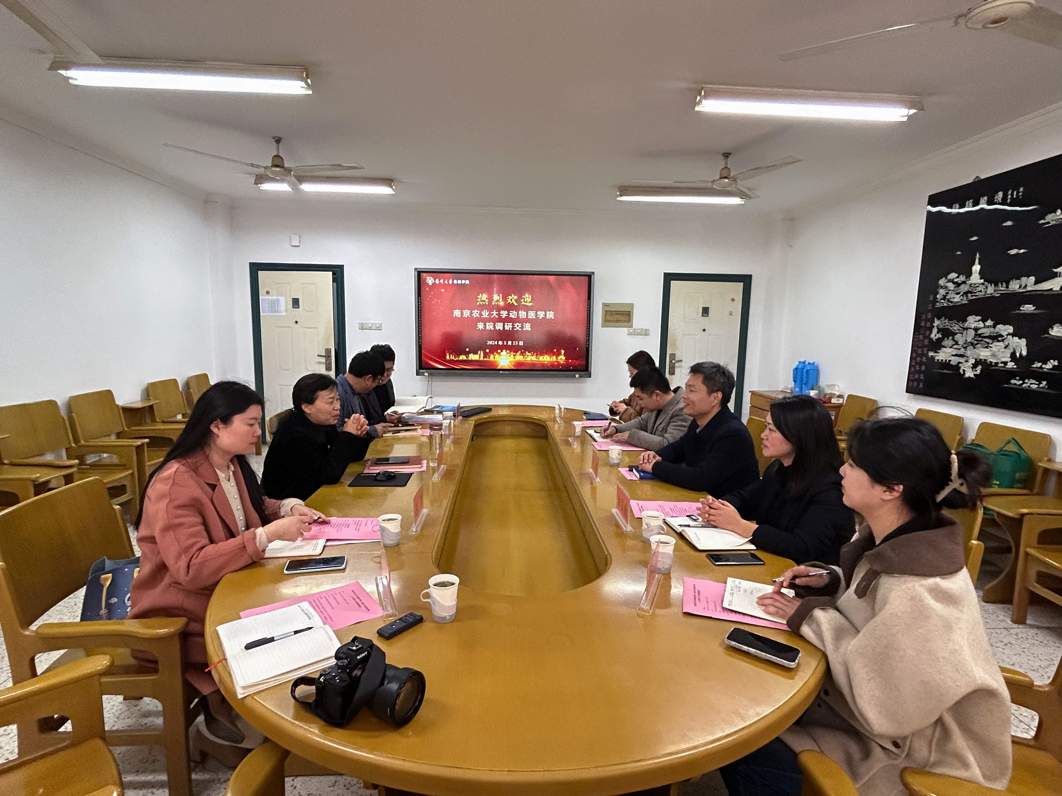 在随后的沟通交流中,气氛热烈而富有成效。李云锋副书记首先对我院学生工作取得的优秀成果表示肯定,并表示从中学习到了许多宝贵经验。双方围绕兽医教育的未来发展和人才培养的创新策略展开了深入的探讨。