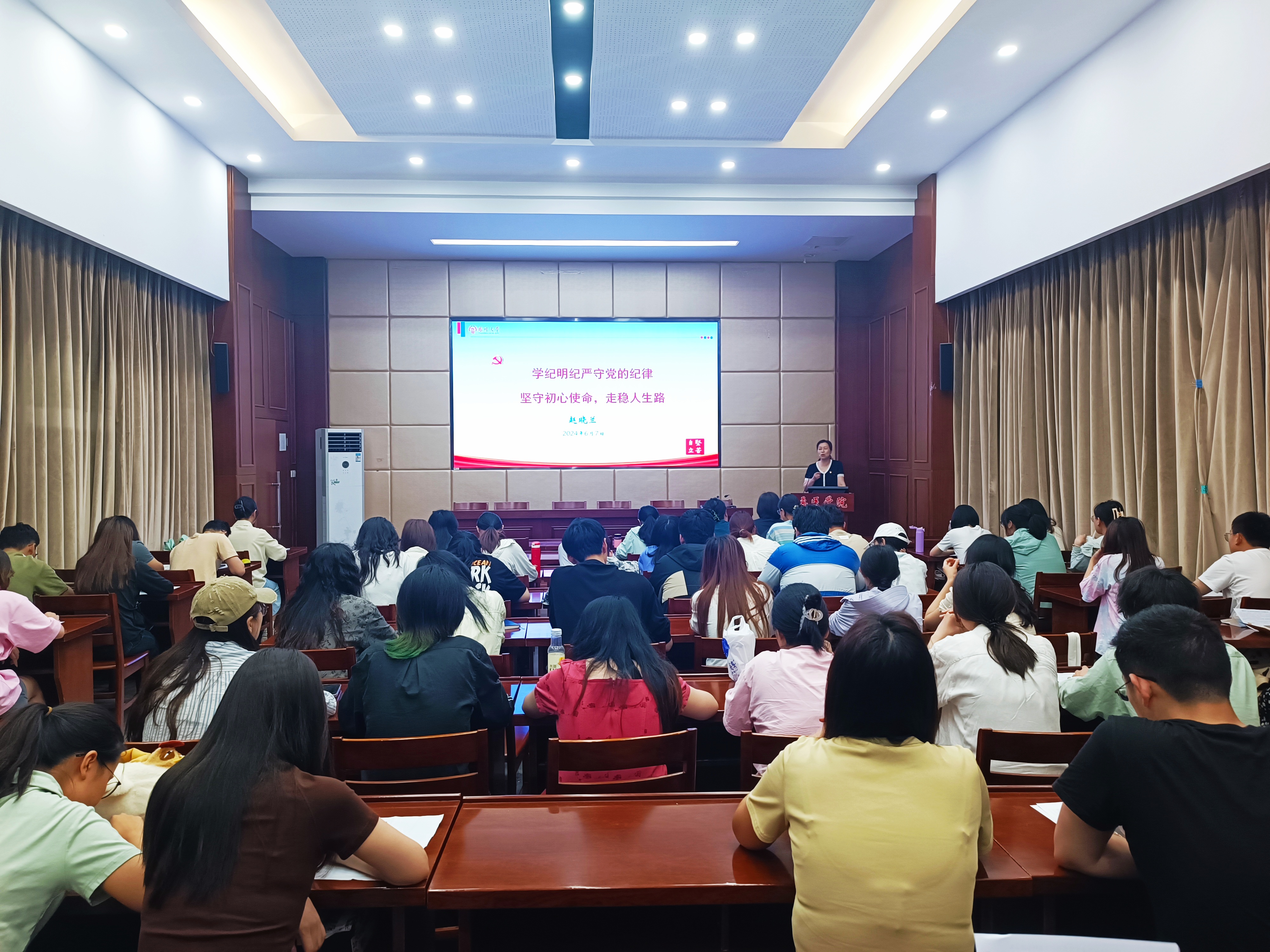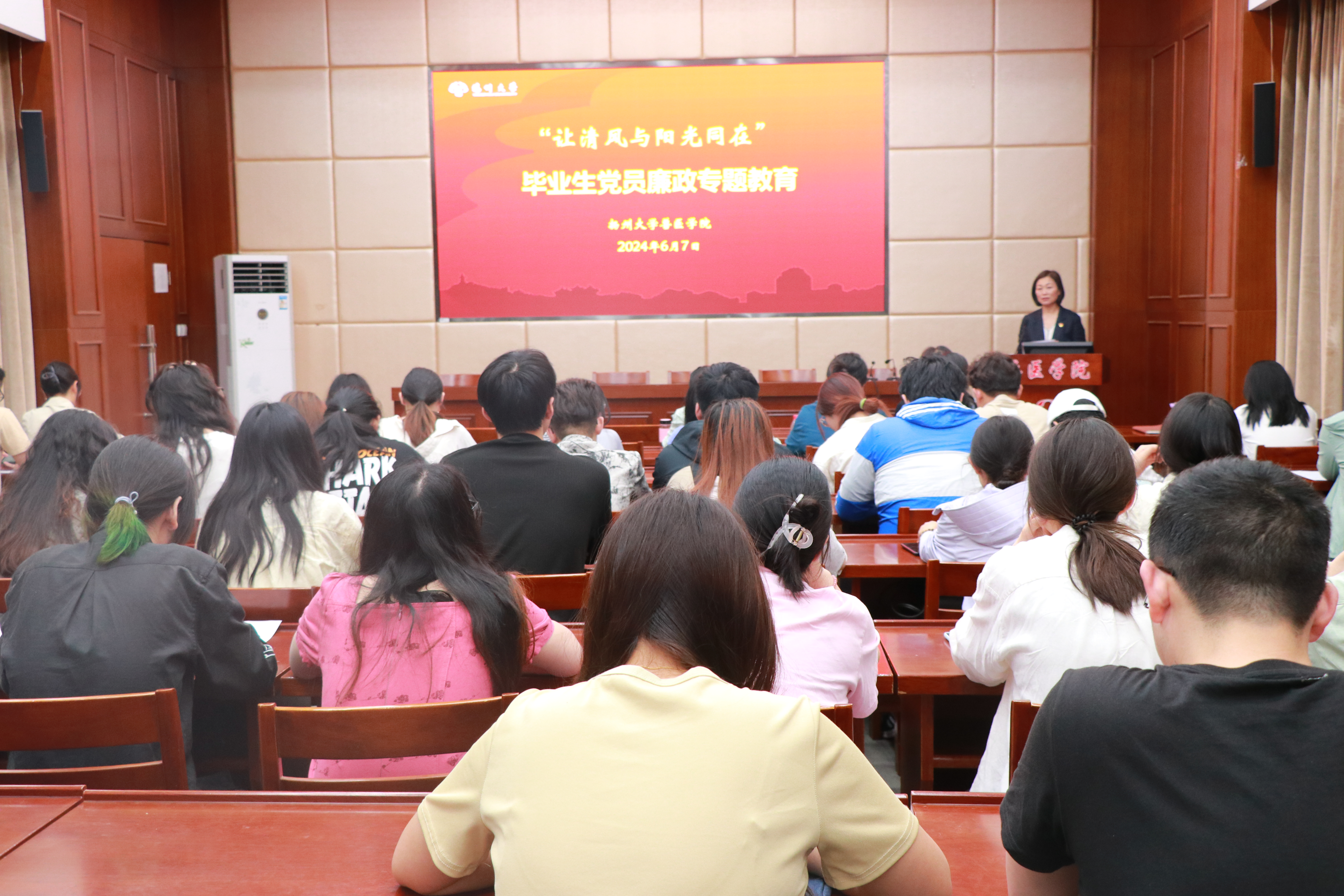 6月7日,兽医学院分党校在2024届全体毕业生党员中开展“让清风与阳光同在”廉政专题教育活动。活动特邀校纪委副书记赵晓兰作专题报告,院党委书记蔡丽娅主持,毕业生党员70余人参加。