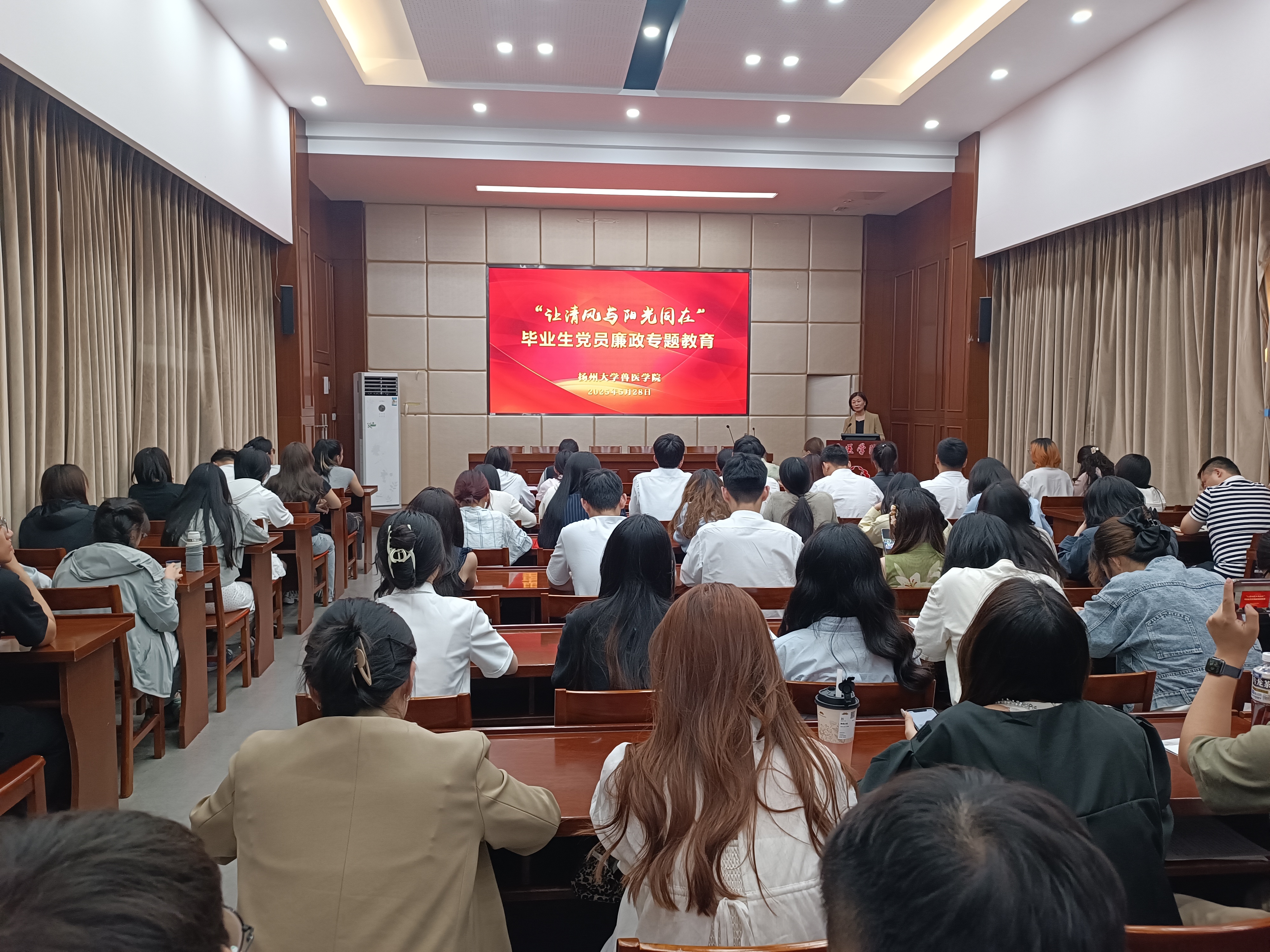活动伊始,学院组织毕业生党员赴平山堂廉政教育基地开展警示教育现场教学,启发毕业生党员从思想上正本清源、固本培元,坚守清正廉洁、崇尚担当实干,真正做到学廉、思廉、倡廉、践廉。院党委书记蔡丽娅作《练好“三功”,远离廉政风险》专题报告,报告从练好思想上的“内功”、守住廉洁自律的“防功”、划清公与私的“硬功”三个方面,通过理论武装和典型案例提醒毕业生党员要树立正确的人生观、世界观、价值观,时刻保持清醒的头脑,筑牢拒腐防变的思想道德底线,清清白白做人,干干净净做事。院党委书记蔡丽娅与毕业生党员畅谈青春理想并寄语全体毕业生党员,希望他们成为一个有“社会担当”和“健全人格”、有“职业操守”和“专业才能”的扬大兽医人。接着,全体毕业生党员重温入党誓词,再一次感受思想的洗礼与升华,强化党性意识,筑牢信仰之基。最后,在廉政歌曲《让清风与阳光同在》的旋律中结束教育活动。