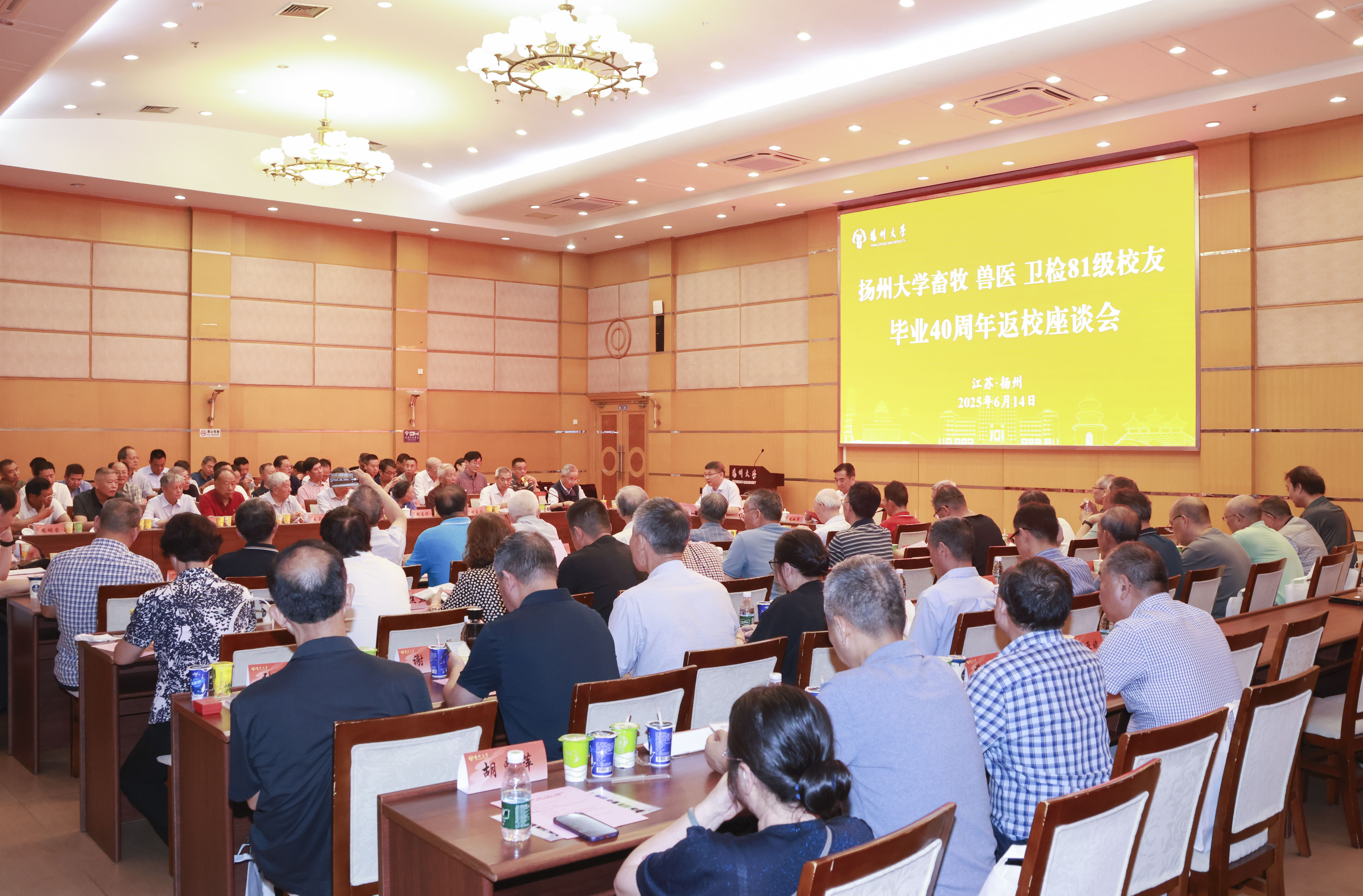 6月14日上午,扬州大学荷花池校区教学主楼二楼多功能厅内,一场意义非凡的盛会——扬州大学畜牧、兽医、卫检81级校友毕业40周年返校座谈会隆重召开。校长刘巧泉出席活动并致以热情洋溢的欢迎辞。校党委副书记、校友会副会长周如军为三位杰出校友代表颁发了校友徽章。校对外联络办公室主任、校友会基金会秘书长陈克勤,动科学院党委书记刘春秋、副书记高红明等出席活动。此外,刘秀梵院士、原校党委副书记梁隆圣、花长友等多位老领导、老教师也莅临现场。本次活动由兽医学院党委书记蔡丽娅主持,60余位校友和20多位嘉宾齐聚一堂,共同追忆青春岁月,展望学院未来。