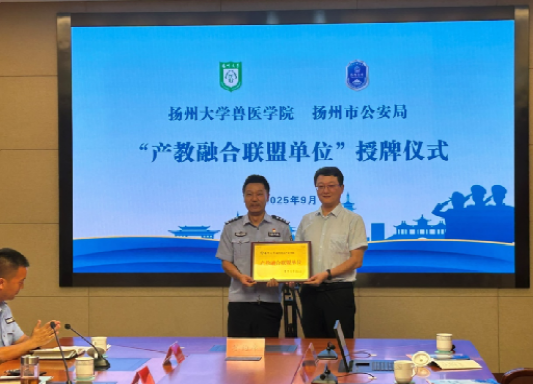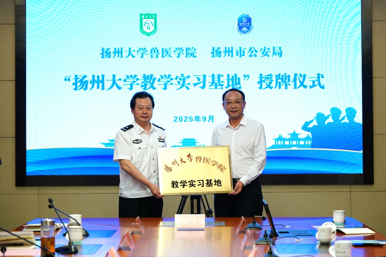 随后,双方举行了合作协议签约仪式,并授予了扬州市公安局 “扬州大学兽医学院教学实习基地”及“产教融合联盟单位”牌匾。