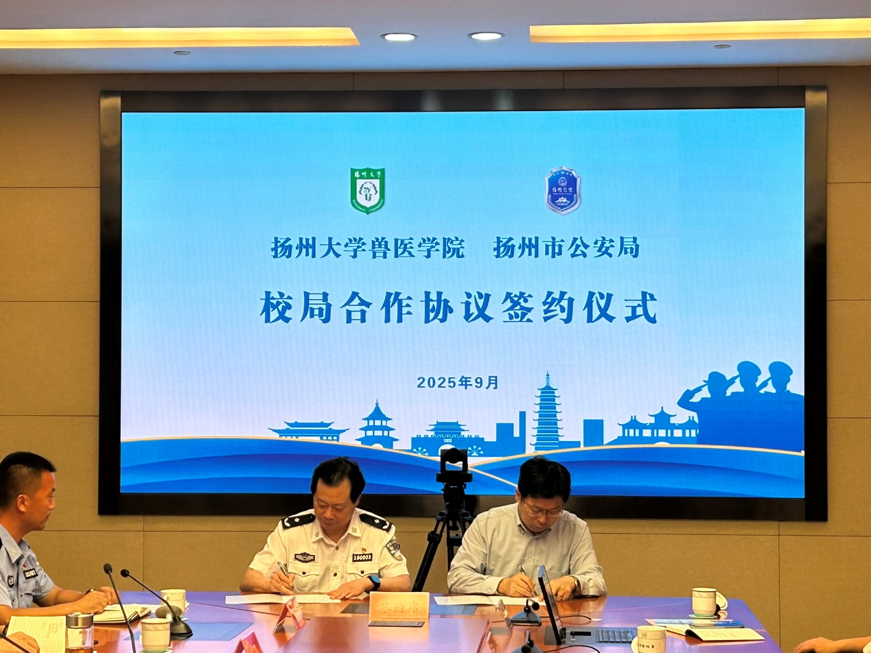 9月29日,扬州大学兽医学院与扬州市公安局在扬州市公安局举行了校局合作协议签约仪式,此举不仅标志着双方在警犬工作领域的合作开启了崭新篇章,更为警犬技术的未来发展注入了强劲动力。