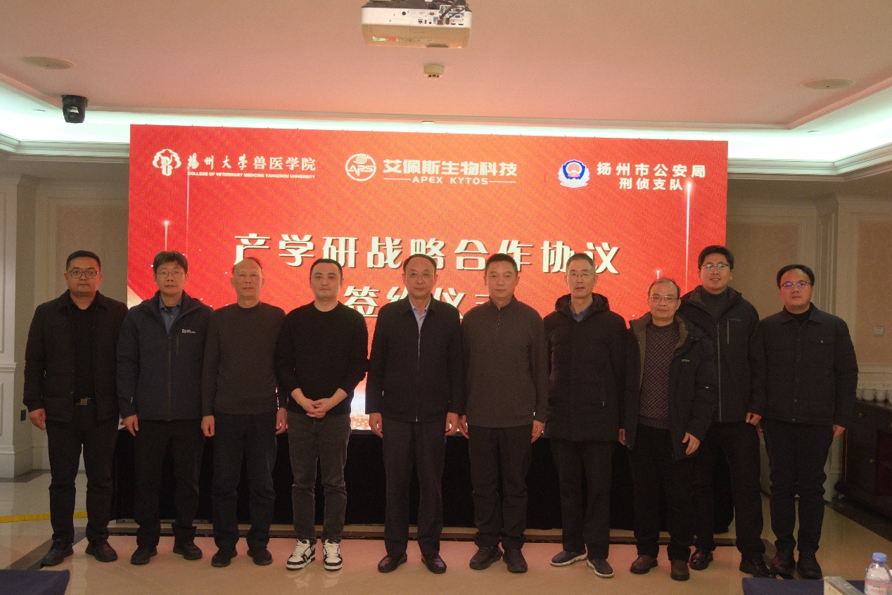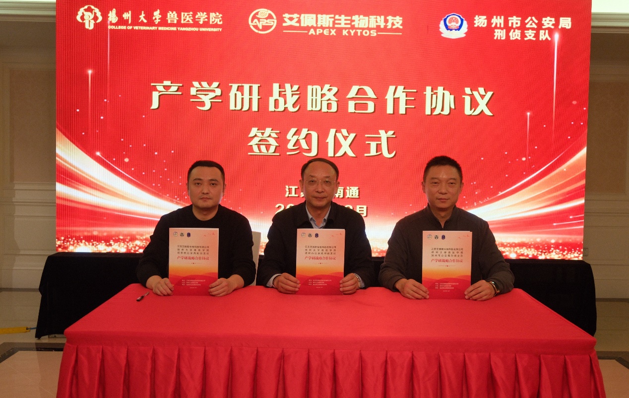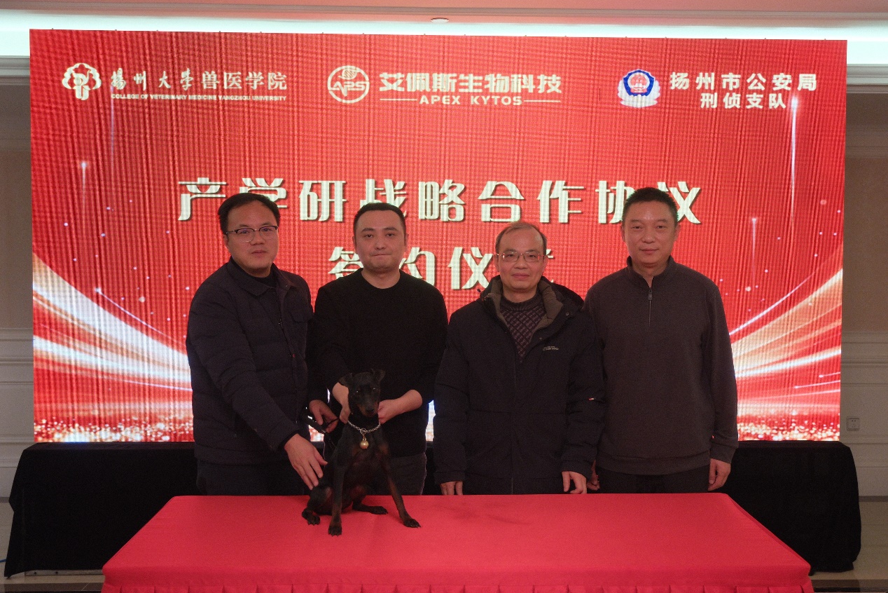 随后,三方代表共同签署产学研战略合作协议,江苏艾佩斯生物科技有限公司向扬州市公安局刑侦支队捐赠太仓犬。