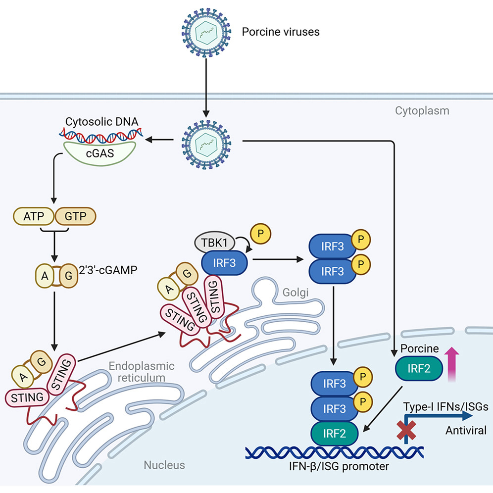 面对非洲猪瘟(ASFV)、猪伪狂犬病(PRV)等猪病毒疫病,先天免疫系统是宿主抵御其入侵的关键防线,其中cGAS-STING-IRF3-IFN信号通路在识别细胞质中病毒DNA并触发干扰素抗病毒反应中扮演核心角色。干扰素调节因子(IRF)家族成员如IRF3已知参与该通路的转录激活,但其它IRF家族成员蛋白的功能尚不明确。