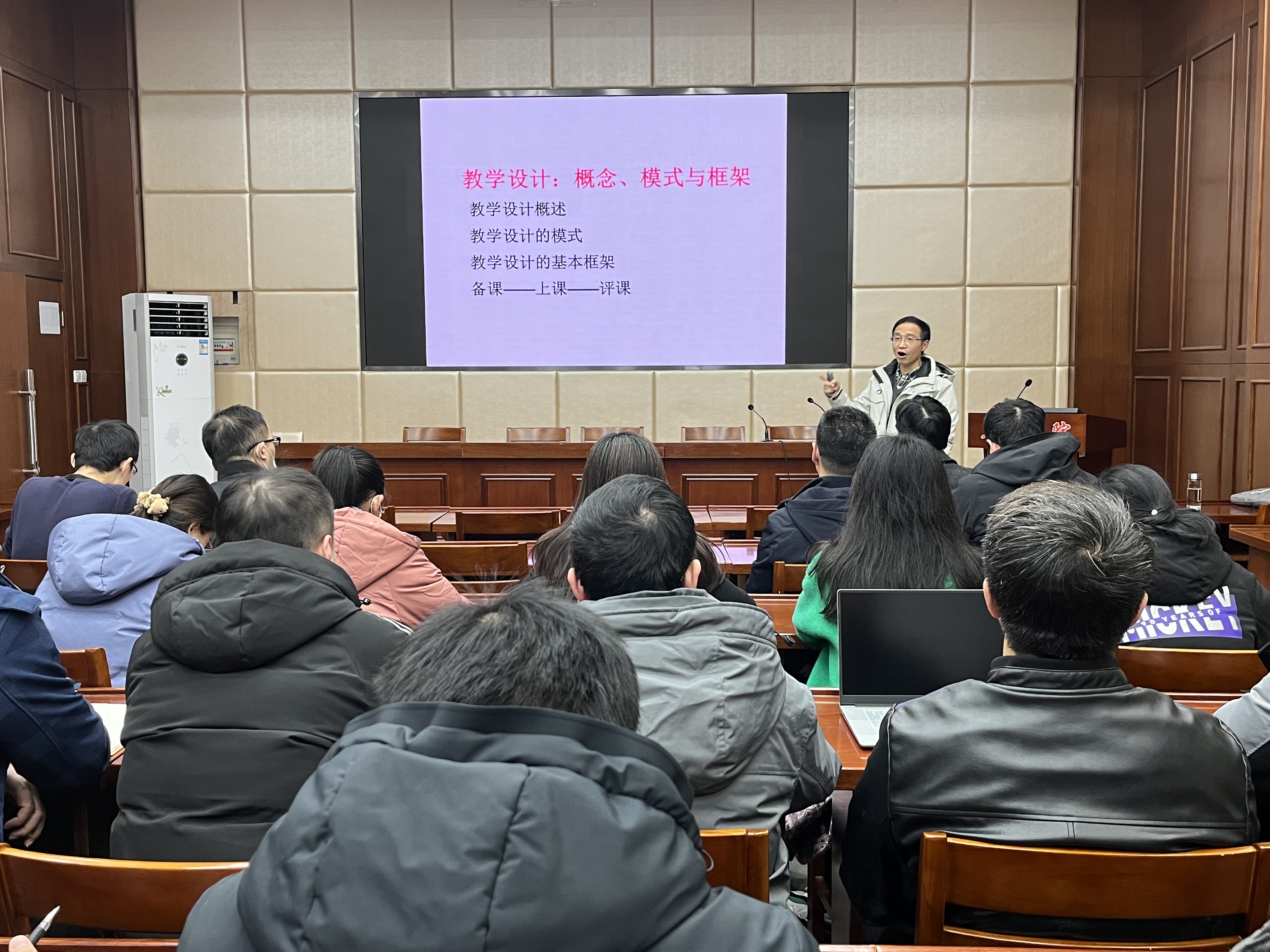本次活动由王志强副院长主持,特邀扬州大学教育科学学院潘洪建教授给大家带来课程教学设计辅导与培训的专题报告,潘洪建教授秉承“教师的本分就是教书育人,提高课堂教学质量是我们义不容辞的责任”的理念,分别从教学设计的概念、教学设计的模式、教学设计的基本框架进行阐述。潘教授提出教学设计的目的是确定合理的教学目标,选择适当的教学方法、教学策略,采用有效的教学手段,创设良好的教学环境,实施可行的评价方案,从而保证教学活动的顺利进行。