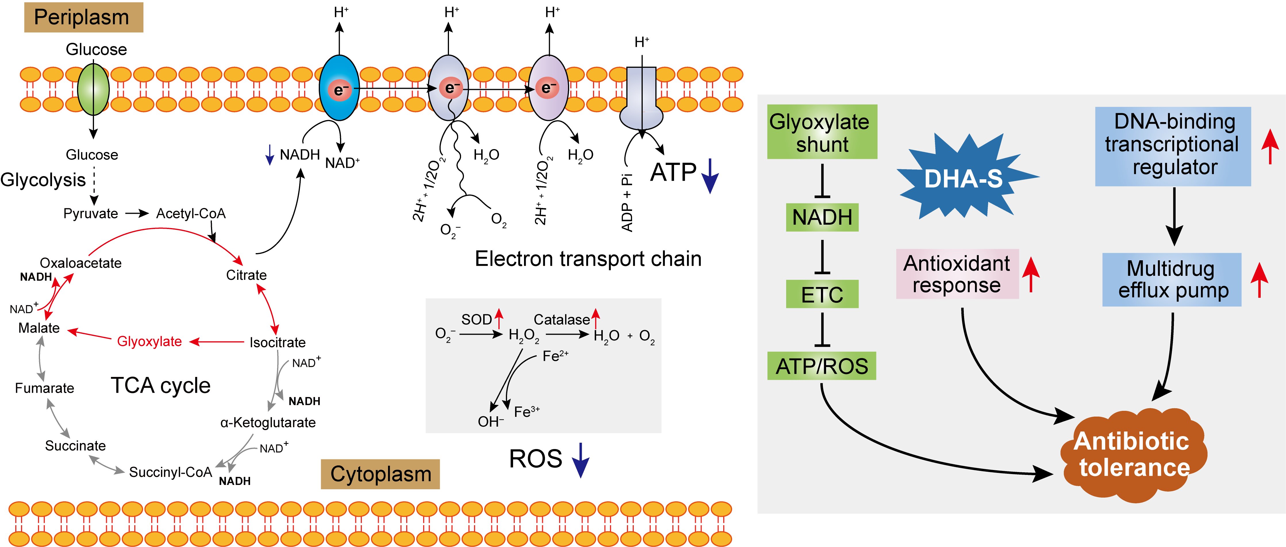 接着,基于RNA-seq、代谢流分析、酶活性分析、基因敲除等试验技术和方法,我们进一步解析了DHA-S诱导抗生素耐受性的分子机制:(1)DHA-S抑制了三羧酸循环中α-酮戊二酸脱氢酶活性,阻止了α-酮戊二酸向琥珀酸的转化;该过程诱导了细菌代谢中的乙醛酸分流,导致氧化还原反应中电子供体NADH降低,最终抑制了细菌细胞的呼吸;(2)DHA-S促进超氧化物歧化酶等抗氧化酶的活性,增强了细菌抗氧化防御;同时增强了细菌外排泵的功能,减少抗生素胞内累积,减轻氧化损伤。这些分子机制共同作用导致细菌对抗生素耐受性的形成以及抗生素疗效的下降。