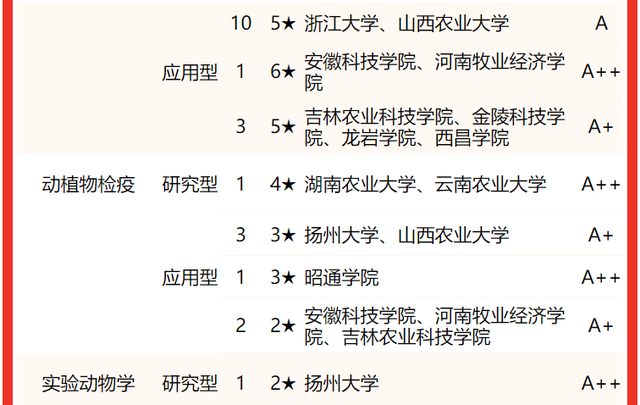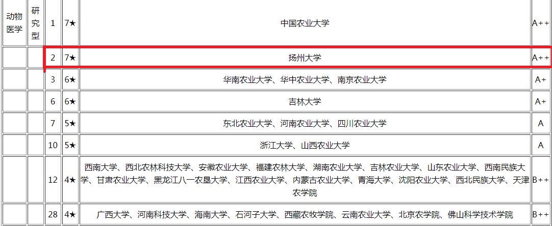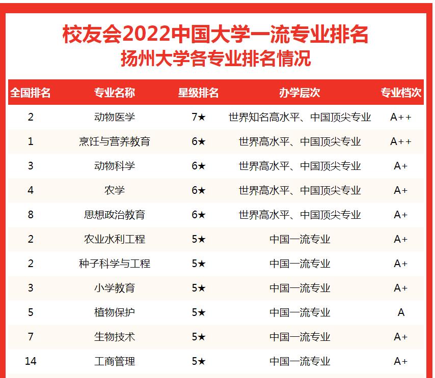 动物医学专业在扬州大学127个本科专业中,以七星级专业(7★)位列榜首,列为世界知名高水平、中国顶尖专业。学院现有动物医学、动植物检疫、实验动物学和兽医公共卫生等四个本科专业,其中兽医公共卫生专业2022年获批新专业。