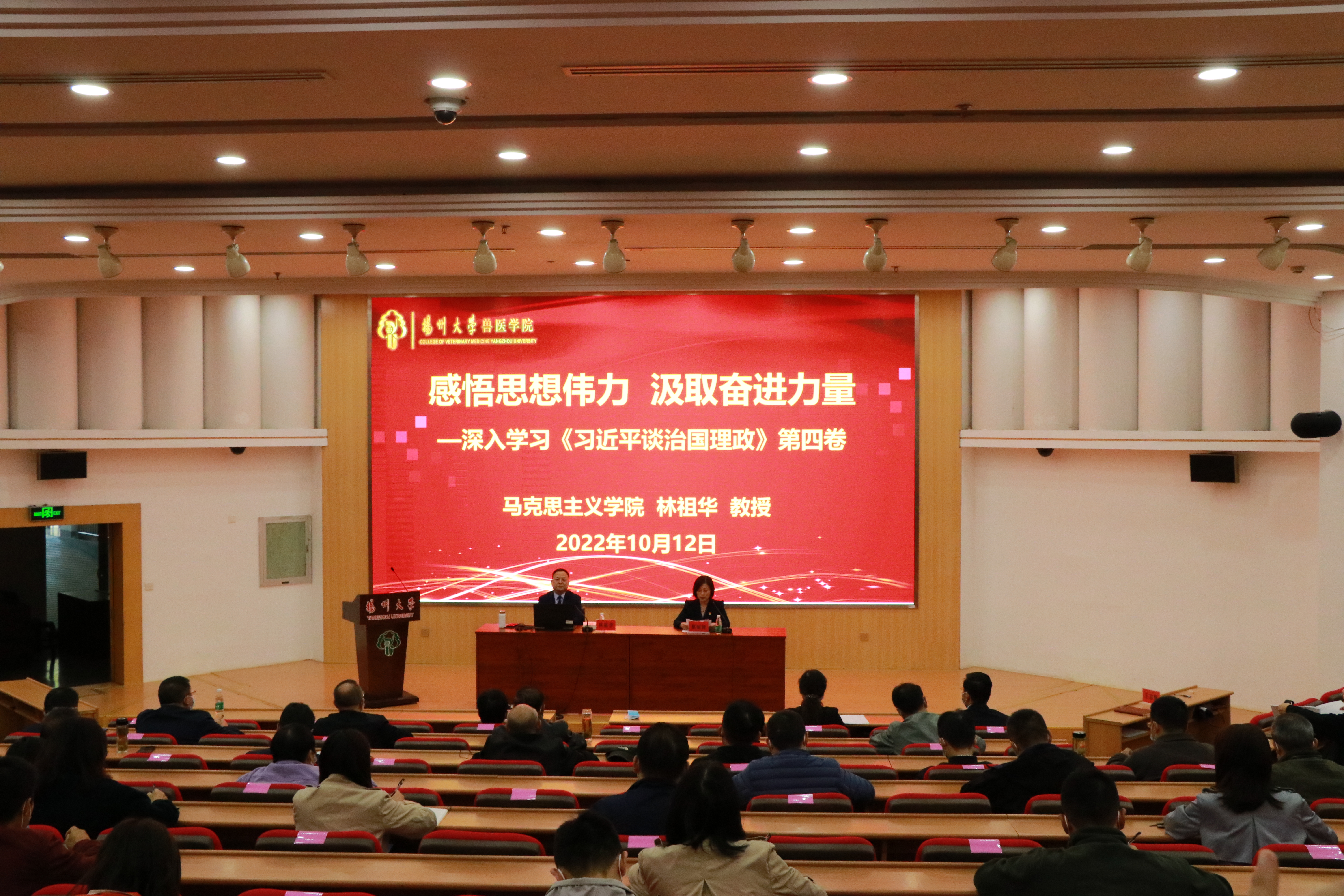 本次学习会特邀扬州市委示范宣讲团成员、我校马克思主义学院林祖华教授作《习近平谈治国理政》第四卷专题学习辅导。林教授作了题为《感悟思想伟力,汲取奋进力量》的专题报告,他从深刻认识第四卷的重大意义、深刻把握第四卷的主要内容、结合实际学以致用学出成效等三个方面作了深入阐述,带领大家深刻学习了《习近平谈治国理政》第四卷的精神实质和核心要义。