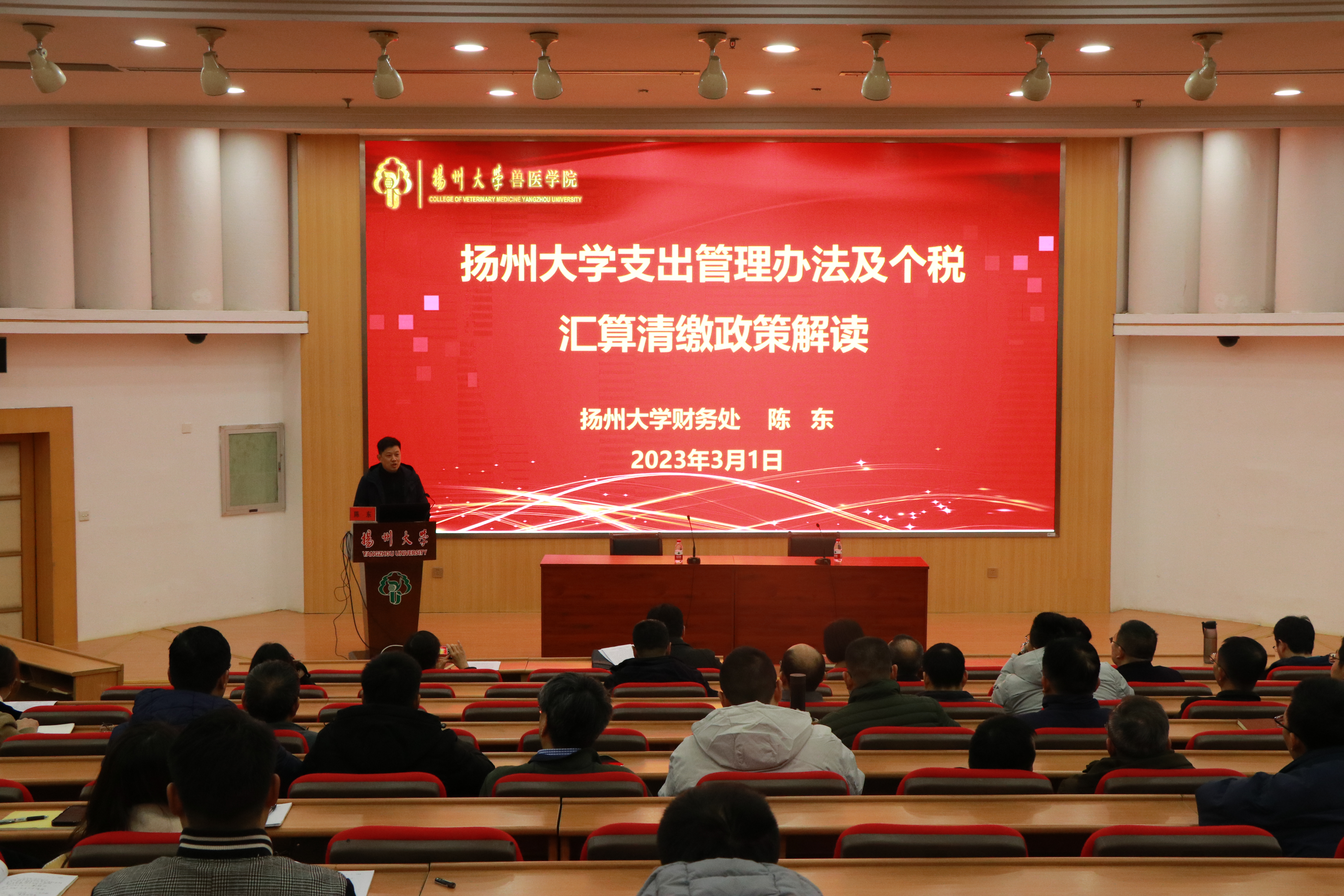 大会伊始,学院特邀学校财务处陈东副处长作关于扬州大学支出管理办法及个税汇算清缴政策解读报告。陈处长从支出审签、支出凭证、纵向科研报销事项以及审批权限与审批程序等方面对学校财务支出管理办法作了深入解读,并对个人所得税汇算清缴操作流程作了详细说明,帮助老师更好地理解和掌握报销政策和基本流程,让教师的教学科研精力更集中,真正做到为教师减负,真正做到管理创新和服务创新。