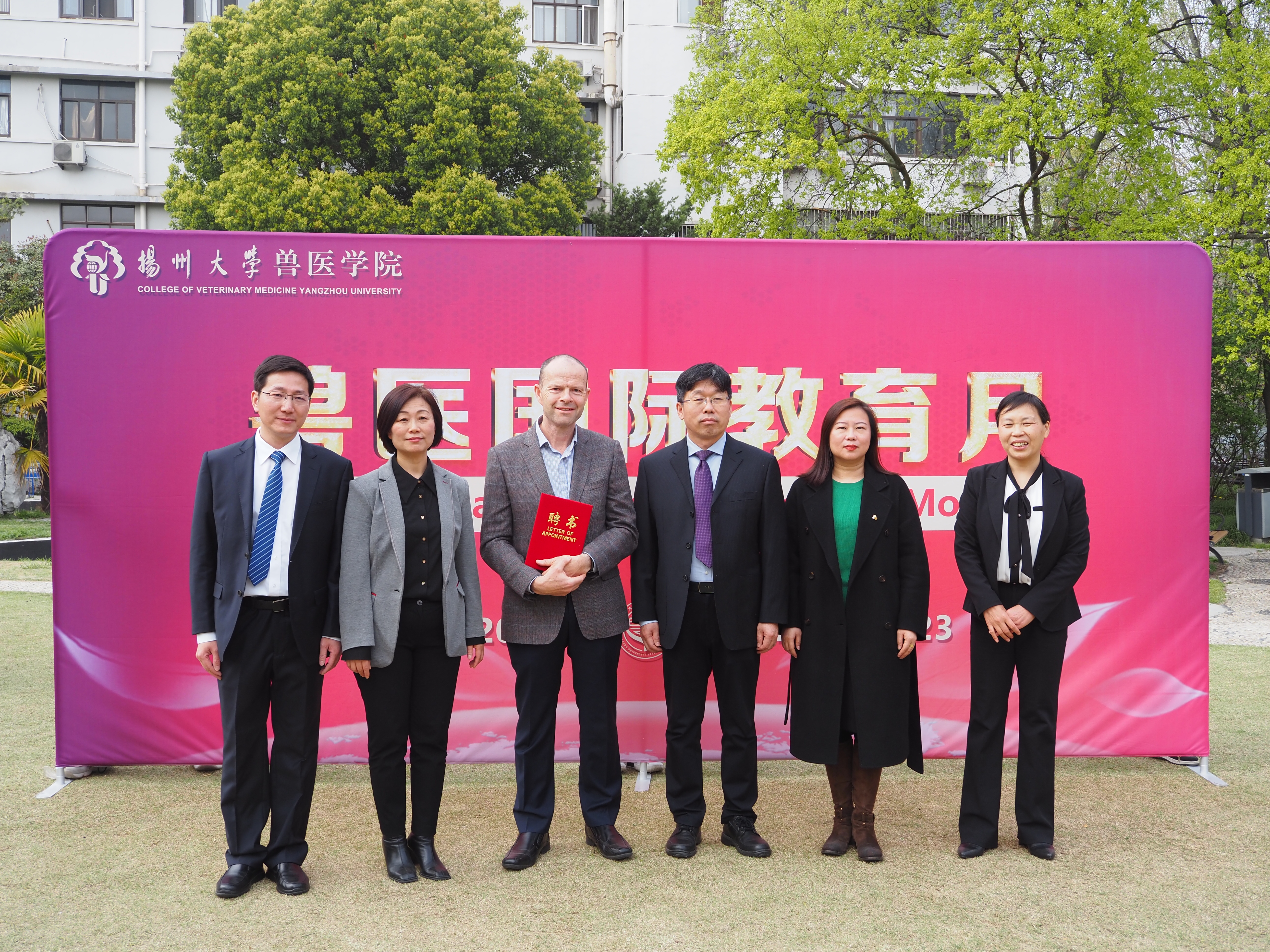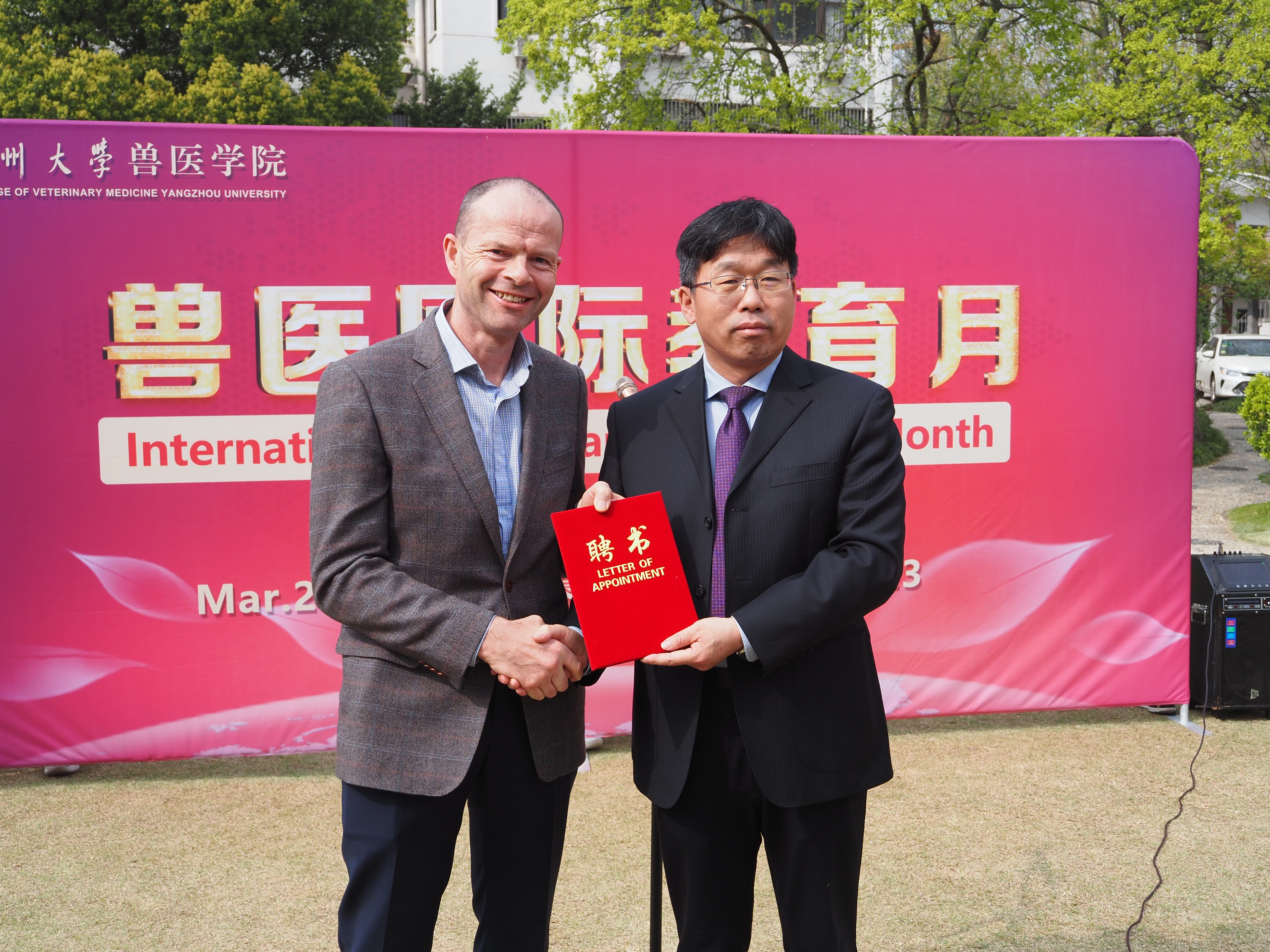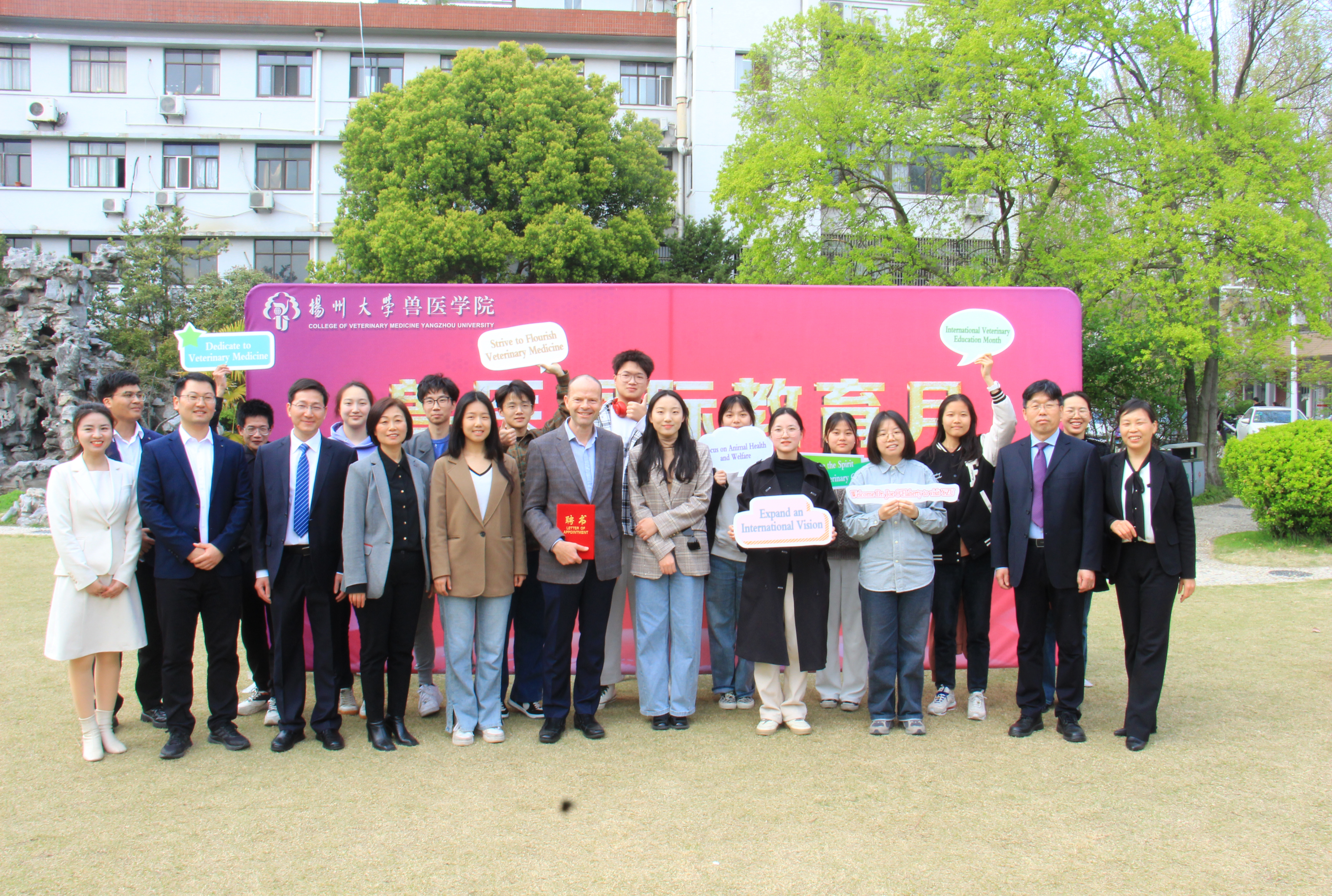 3月30日下午,学院在文汇路校区张謇小花园隆重举行兽医国际教育月启动仪式。爱尔兰兽医专家Dr.Joe O’Flaherty、学校国际合作与交流处张吟处长、兽医学院蔡丽娅书记、王志强院长、沙爱红副书记、钱琨副院长、留学归国青年学者代表李军伟老师、全体辅导员及部分学生代表出席活动。