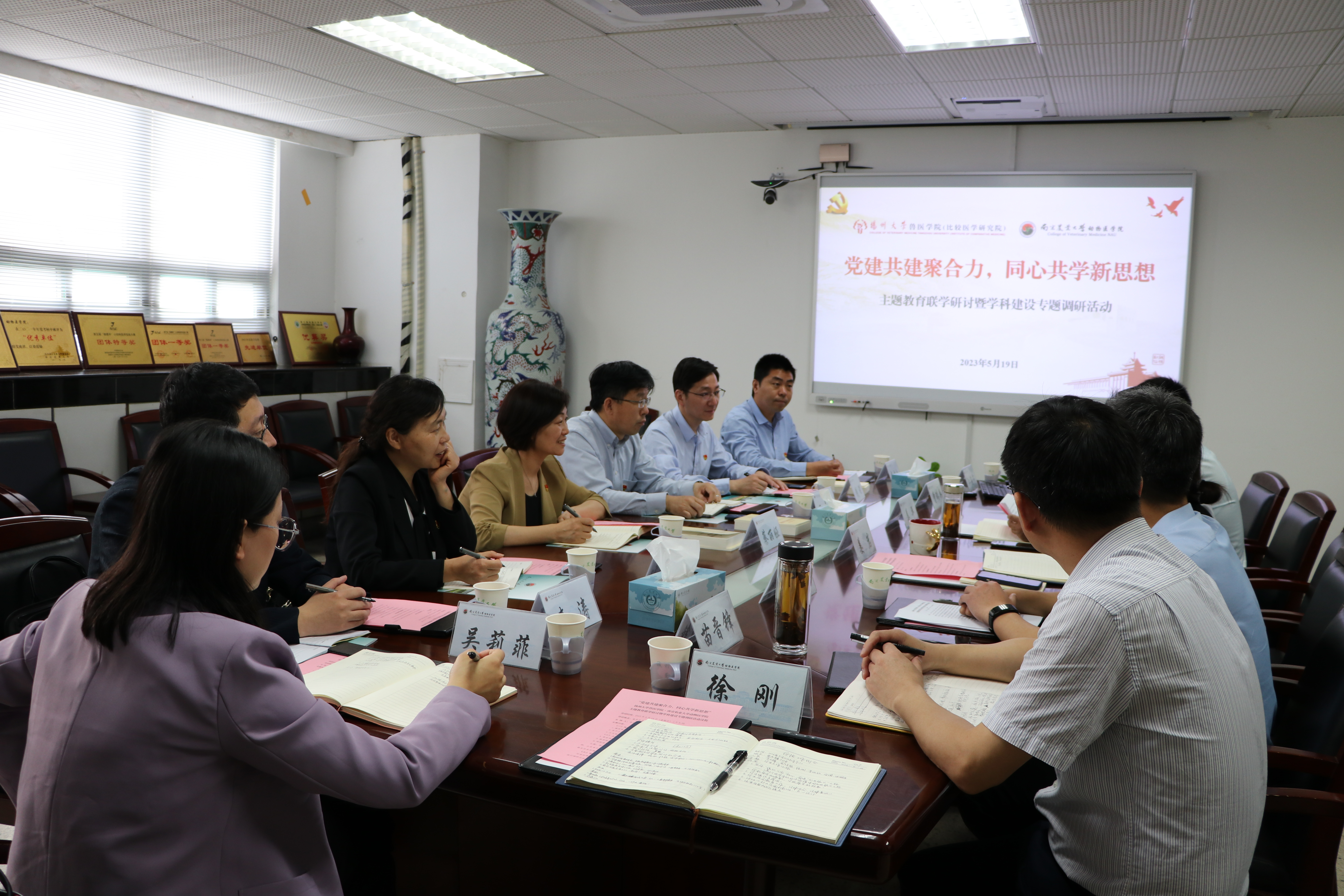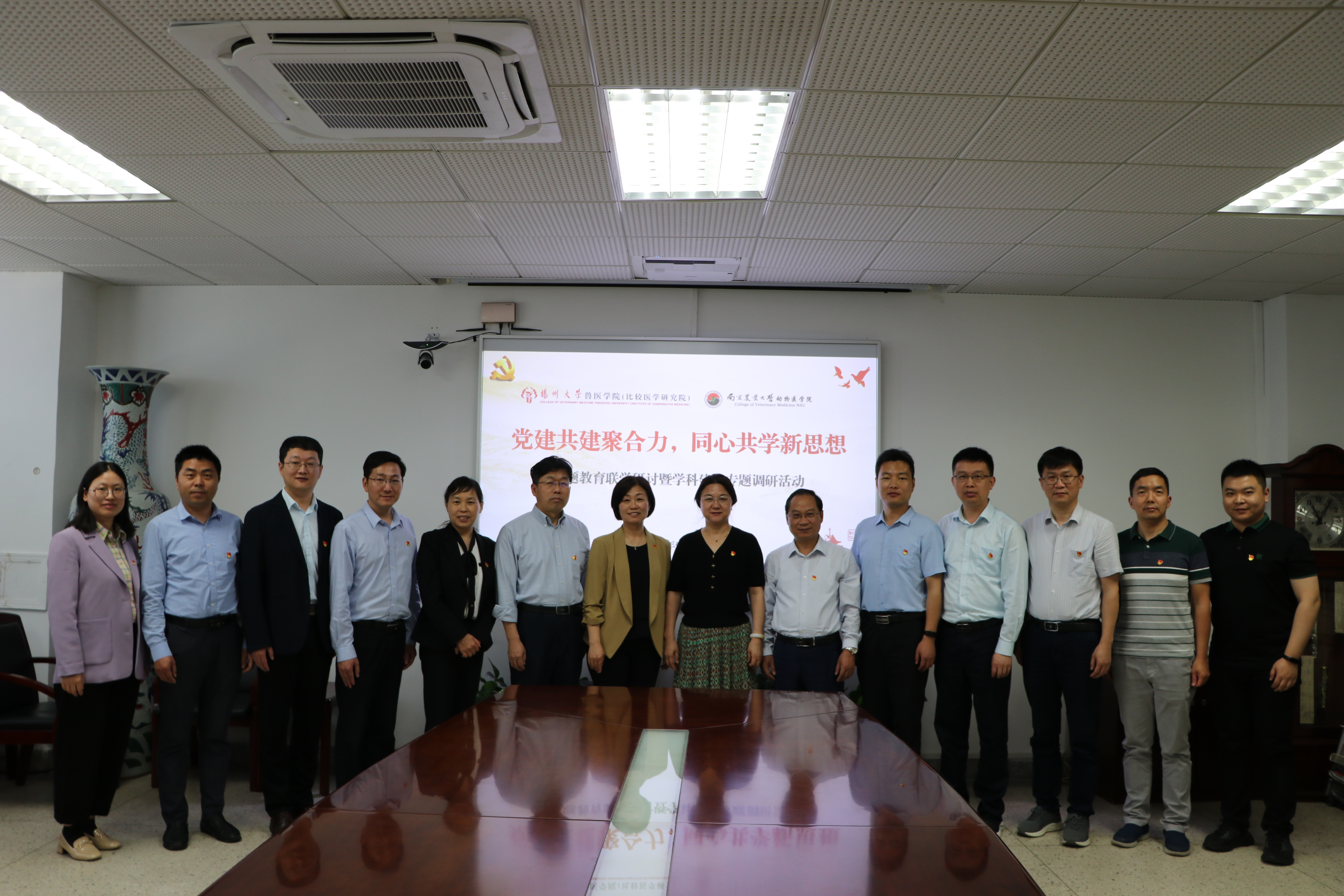 5月19日上午,我院党委联合南京农业大学动物医学院党委,在南京农业大学逸夫楼3036会议室开展“党建共建聚合力,同心共学新思想”主题教育联学研讨暨学科建设专题调研活动。南京农业大学动物医学院党委书记姜岩、院长姜平、党委副书记李云锋、副院长曹瑞兵、苗晋锋、办公室主任江海宁、学工办副主任(组织员)徐刚参加会议;我院党委书记蔡丽娅、院长王志强、党委副书记沙爱红、副院长钱琨、秦涛,办公室主任李启波、副主任(党务岗)吴莉菲参加会议。会议由南京农业大学动物医学院党委副书记李云锋主持。